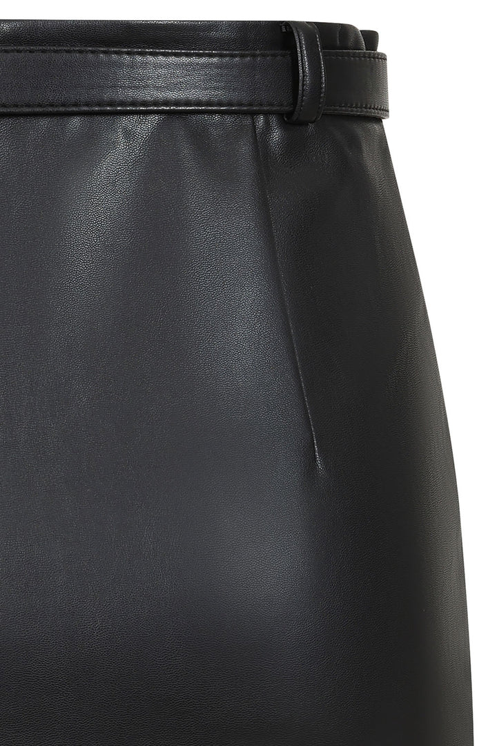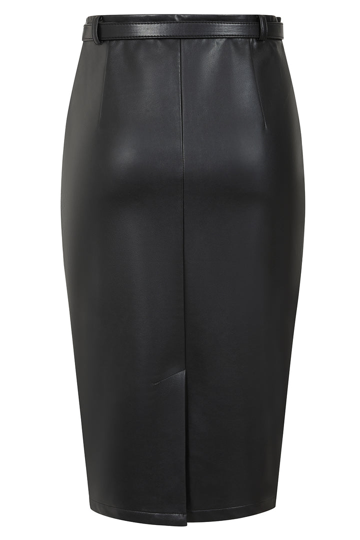 Banned's sleek fitted pencil skirt crafted in PU Vegan leather. Features classic secretary styling with waist-defining belt and back opening. Perfect for vintage lovers seeking edgy professional style.