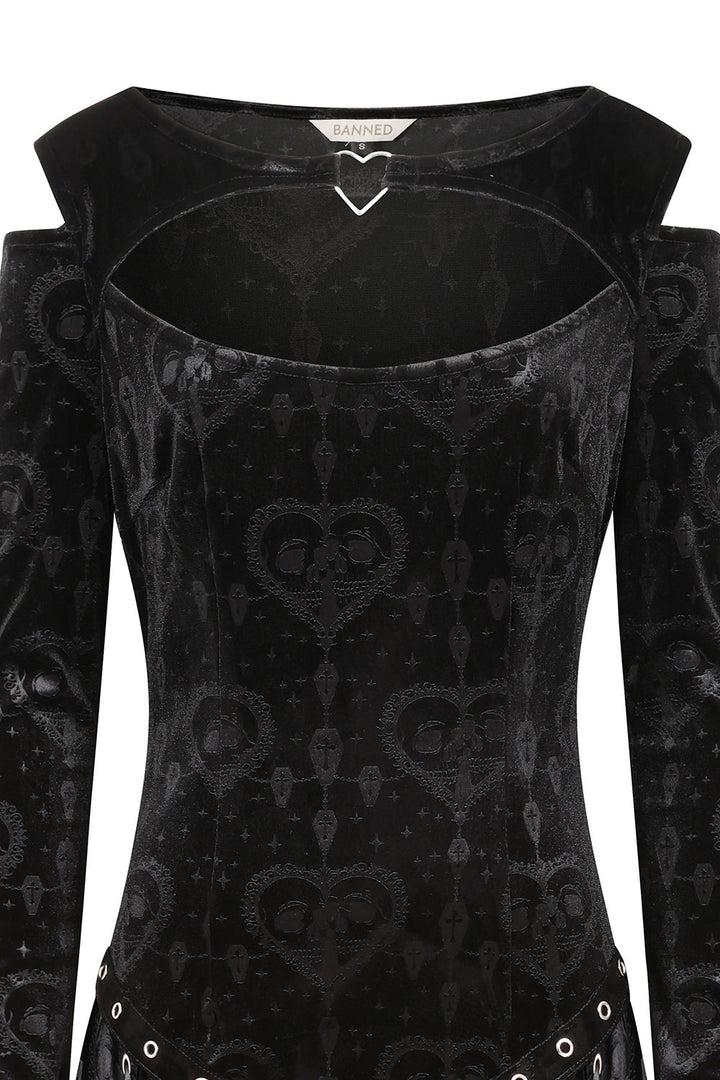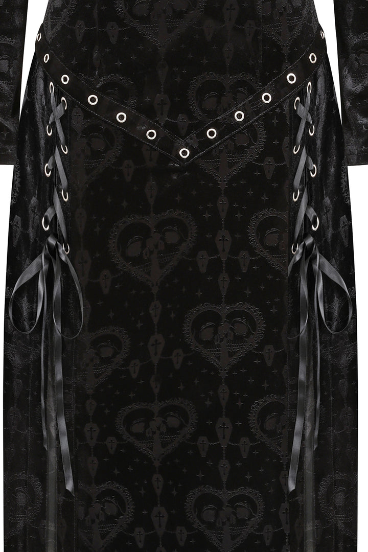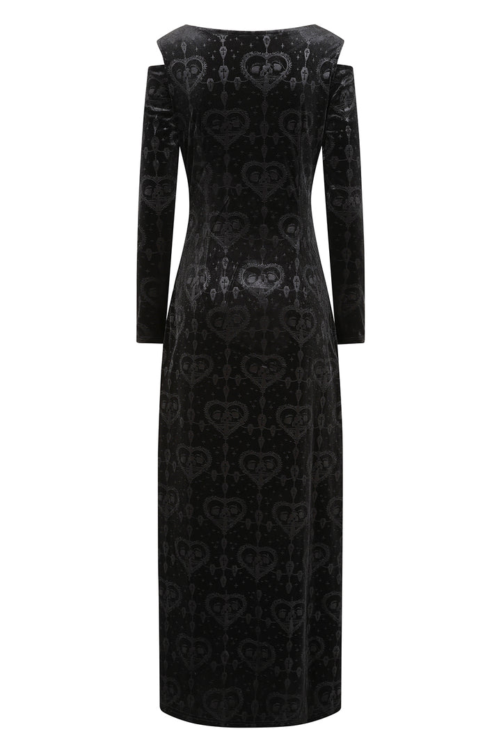 This long gothic dress is made from in-house designed burnout velvet fabric, giving it a luxurious textured pattern. It features long sleeves with cold-shoulder cutouts for an edgy look and a sweetheart neckline adorned with a heart-shaped metal detail at the center of the chest. The waistline is accented with eyelet grommet details and corset-inspired lace-up ties running vertically down the skirt's front, adding a dramatic gothic vibe. The long length design and flowing silhouette create a flattering and elegant fit, perfect for alternative fashion lovers.