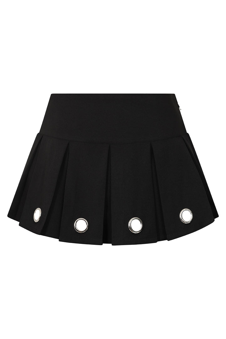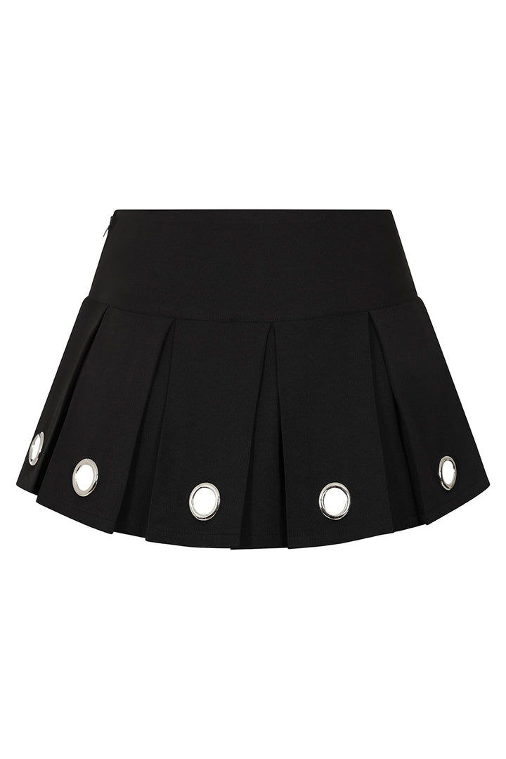 This alternative Y2K mini skirt features a bold, edgy design. Made from a structured black fabric, it showcases sharp pleats for added volume and movement. The standout detail is the row of large metallic eyelets along the hem, adding a punk-inspired vibe typical of early 2000s alternative fashion. The medium-waisted design provides a flattering silhouette, while a discreet side zip ensures a secure and streamlined fit. This skirt perfectly captures the rebellious spirit of Y2K style, ideal for pairing with fishnet tights, chunky boots, and crop tops.