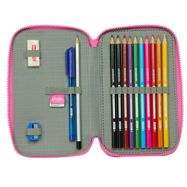 Size: 12,5x4x19,5cm. Contains 28 pieces: eraser, graphite pencil, blue biros and pencil sharpener (first compartment), 10 wooden crayons and 14 coloured markers (second compartment).