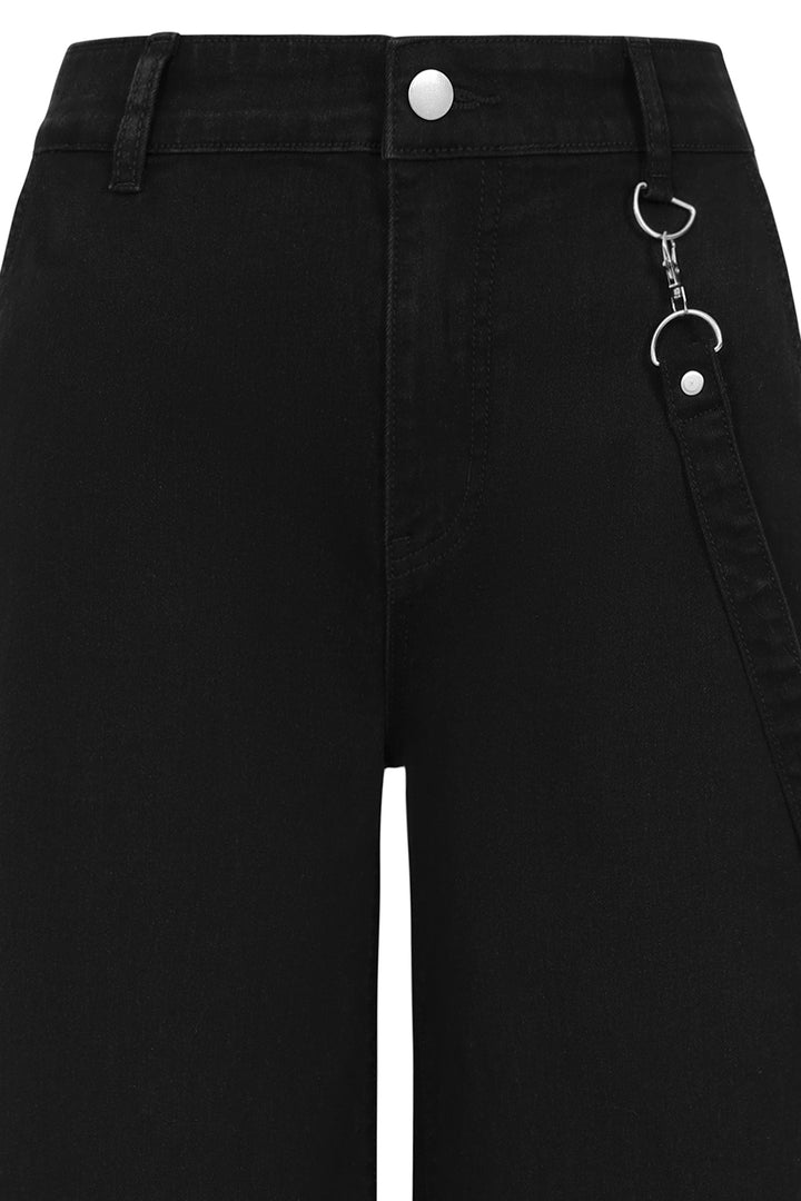 These Banned alternative black trousers have a striking design that combines edgy and utilitarian elements. They feature wide legs with mesh panels on the thighs, framed by diagonal fabric overlays adorned with metal rivets for a bold industrial look. A detachable strap with silver hardware, including metal rings and a clasp, adds a utilitarian touch, hanging stylishly from the waistband. The high-waisted design includes a button closure and belt loops for a secure fit. These trousers blend statement details with functional accents, making them a standout piece in alternative fashion.