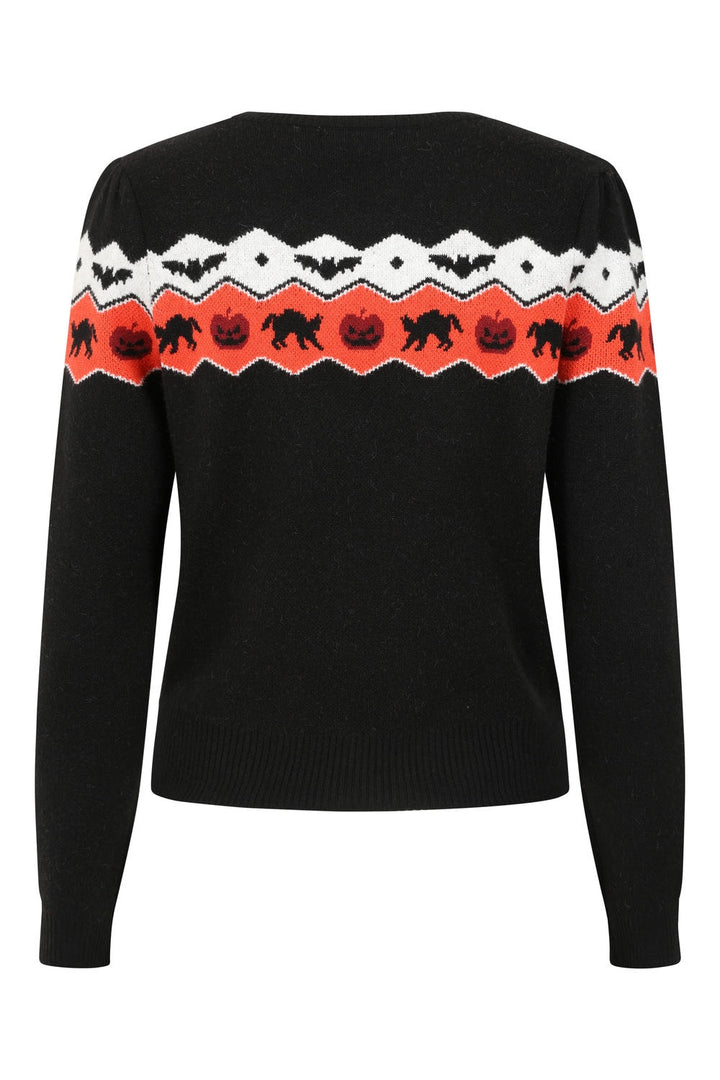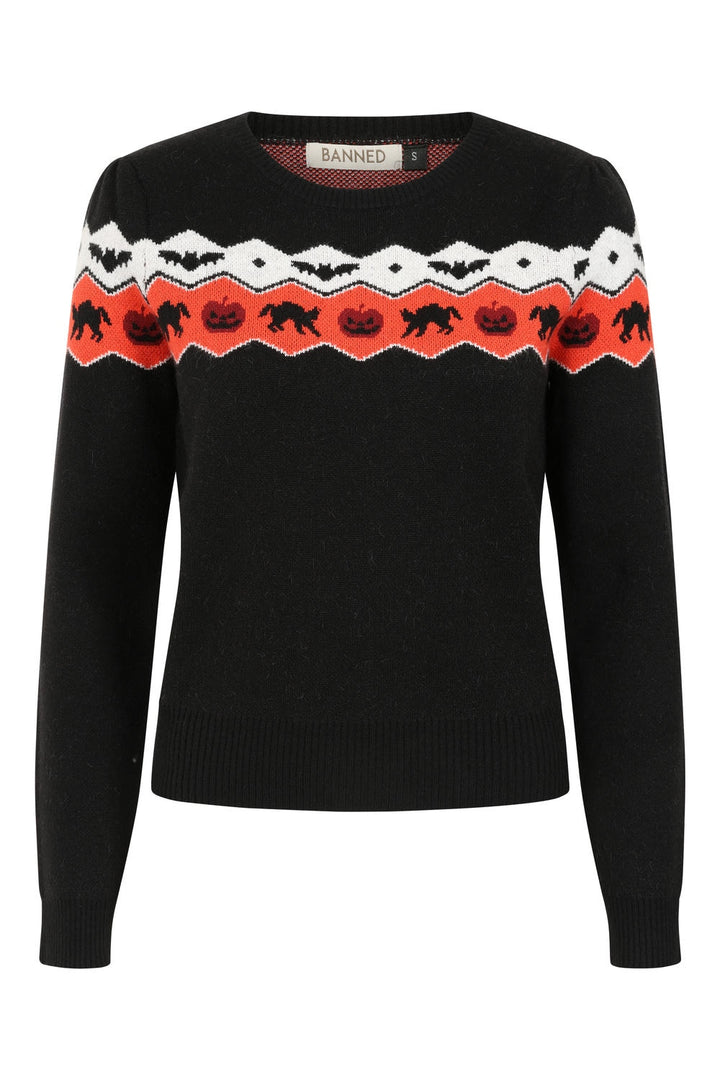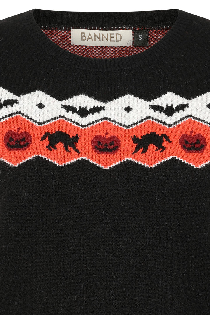 Banned's spooky knit jumper featuring Halloween-themed intarsia across shoulders with black cats and pumpkins. Classic 3/4 sleeves with ribbed cuffs and hem. Perfect for vintage-inspired autumn style.