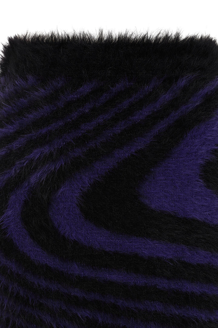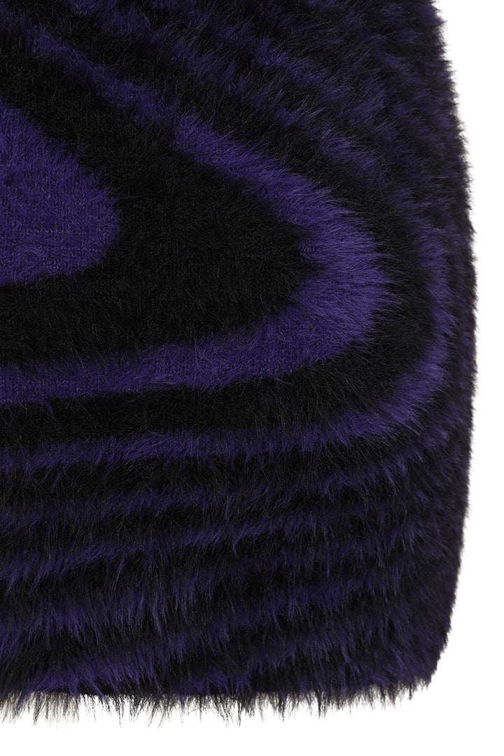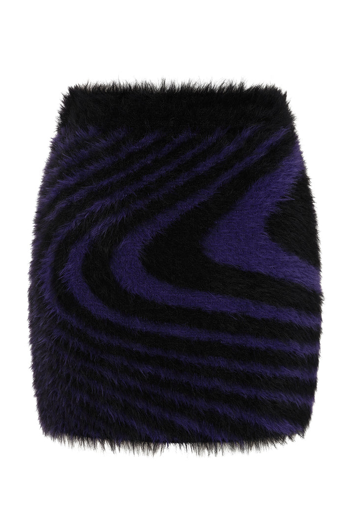 This alternative mini skirt is designed with a fluffy, soft-textured fabric, exuding a bold and cozy vibe. The striking purple and black swirl pattern creates a dynamic visual effect, making it a standout piece. The fitted silhouette accentuates the figure while maintaining a playful, edgy aesthetic. This skirt adds a touch of alternative style to any outfit.