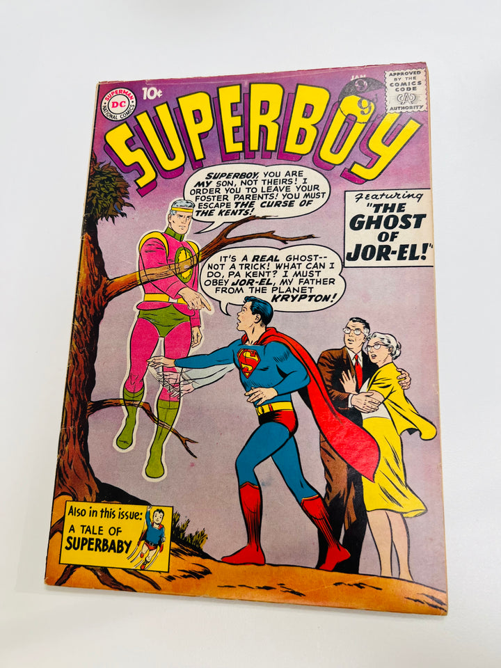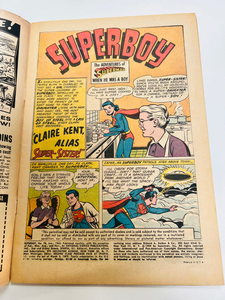 Claire Kent, Alias Super-Sister!": Superboy is patrolling the skies of Smallville when he encounters a spaceship piloted by a woman. The spaceship is out of control and is about to crash when Superboy comes to the rescue. Superboy is critical of the pilots flying skills because she is a woman a Superboy #78 is an issue of the series Superboy Volume 1 with a cover date of January, 1960. It was published on November 19, 1959.