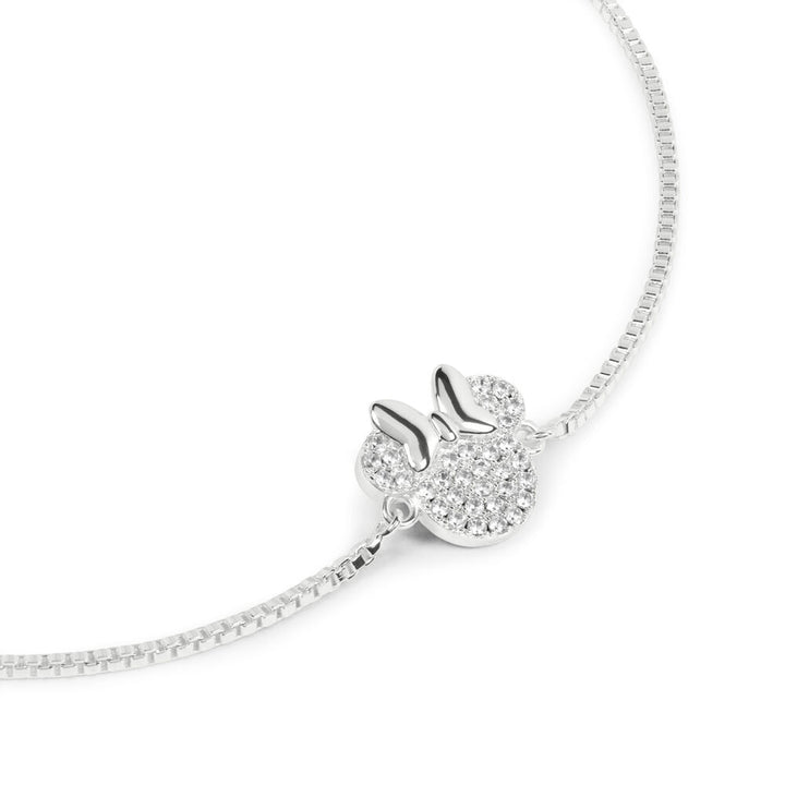 Featuring an adjustable silver-plated chain with a sparkling Minnie Mouse cubic zirconia stone set charm.