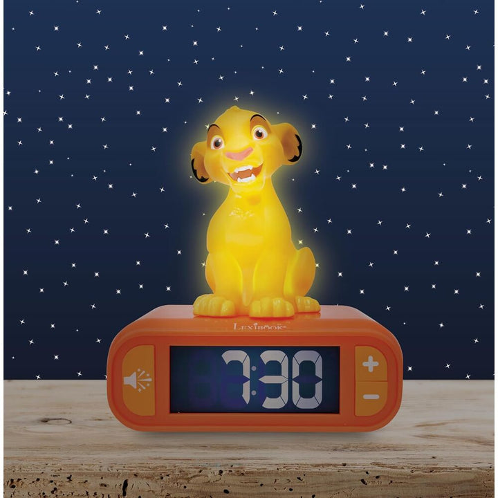 Age: +3 years. Enjoy peaceful nights with the option to dim or keep the LCD screen off, ensuring a restful sleep without disturbing light. Choose from 6 delightful tones and 6 sounds from the world of The Lion King. Enjoy adjustable volume and snooze function for a personalised wake-up call. Simply touch the top or Simba to silence the alarm, making mornings a breeze, and never miss a beat with the low battery indicator. Conveniently powered by 3 AA/LR6 batteries (not included).