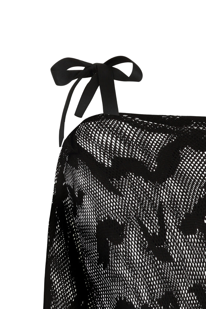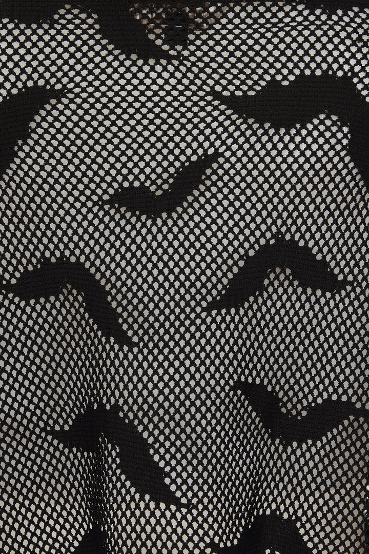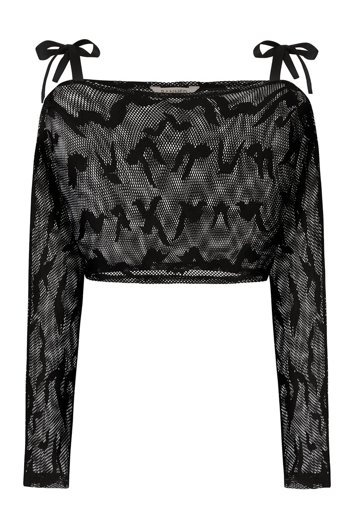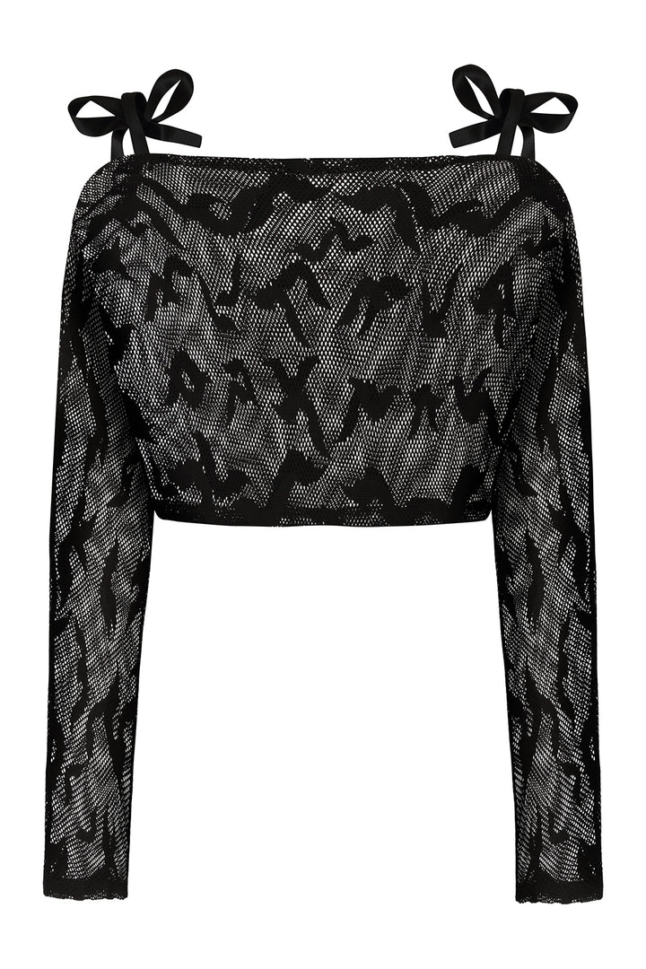This top is crafted from an in-house designed fishnet fabric, featuring intricately woven bat motifs that add a bold, gothic flair. The sheer black material offers a delicate yet edgy aesthetic, perfect for layering or making a statement on its own. Its cropped length and long sleeves create a flattering silhouette, while the shoulder ties with ribbon bows provide an adjustable and feminine touch. This design seamlessly blends alternative fashion with a creative, one-of-a-kind fabric, making it an ideal choice for those who love unique, darkly inspired clothing.