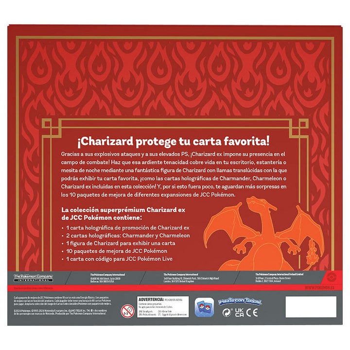 Size: 22,4x24,9x20,9cm. Language: English. Age: +6 years old. 1 Charizard ex holographic promo card, 2 holographic cards: Charmander and Charmeleon, 1 Charizard figure to display a card, 10 Pokémon TCG upgrade packs, 1 Pokemon Live TCG code card.
