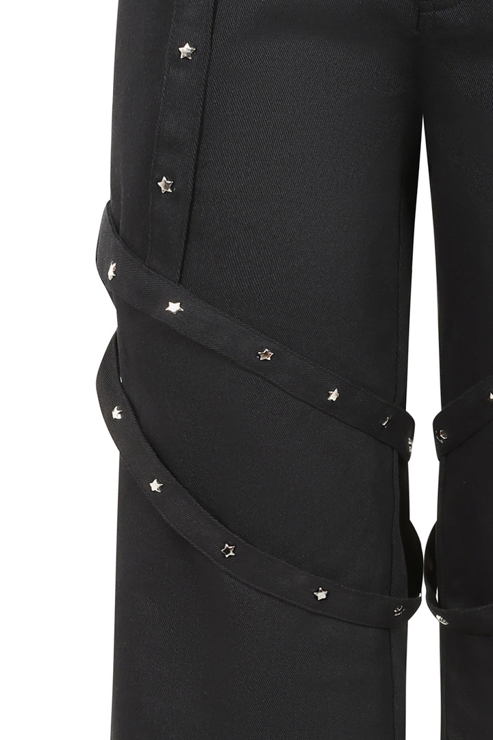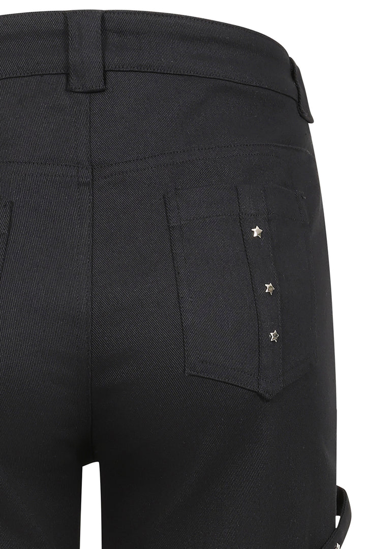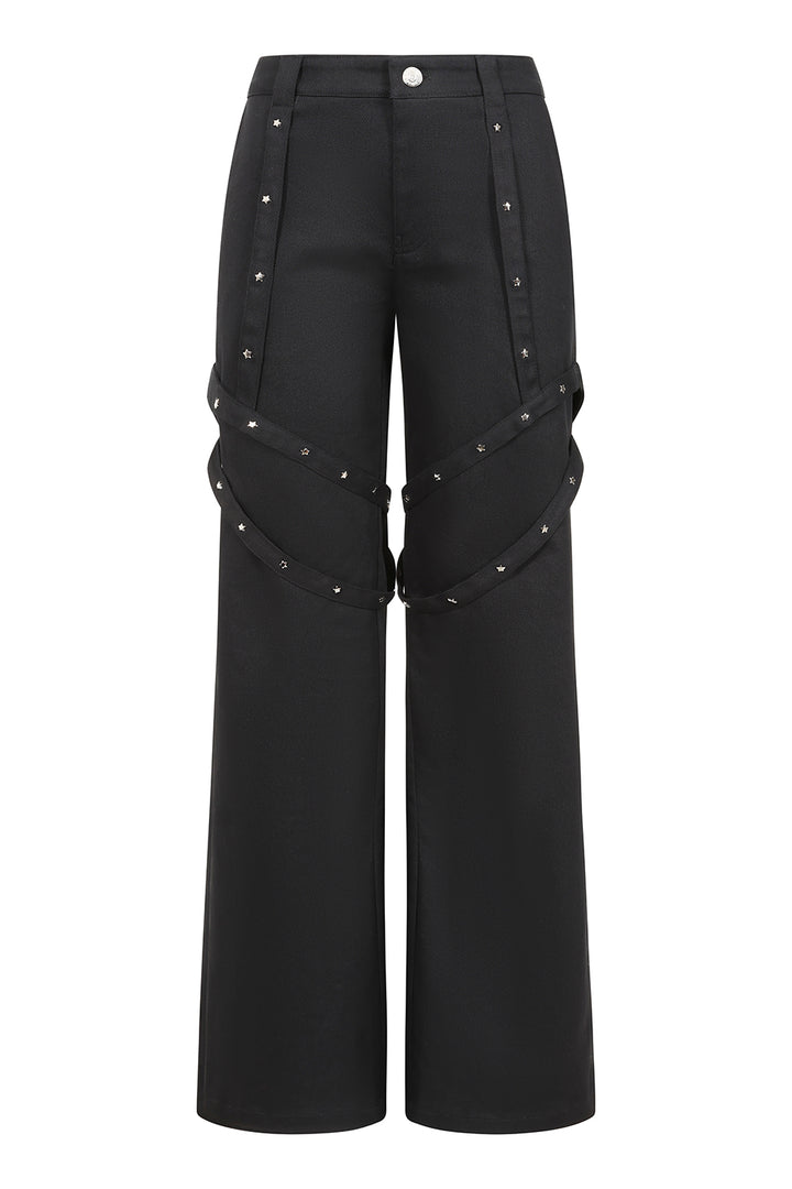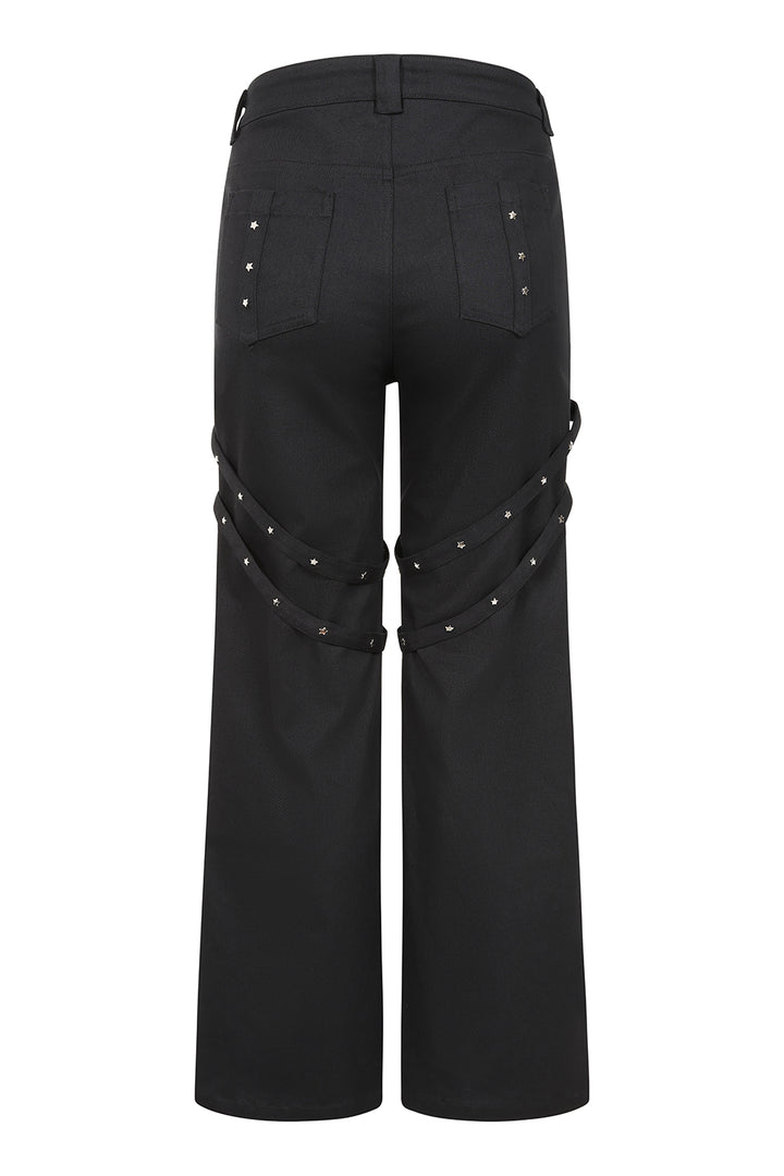 These black Banned alternative trousers feature a bold and edgy design with a flared silhouette that captures an alternative aesthetic. The trousers are adorned with straps running vertically along the legs and horizontally across the thighs, detailed with silver stud embellishments, giving them a punk or goth-inspired look. The front design includes functional pockets and a button closure, adding practicality without compromising style. The back features additional straps with matching studded accents on the pockets and thighs, tying the whole look together. The wide-leg fit enhances movement and comfort while making a striking statement, perfect for alternative fashion enthusiasts.