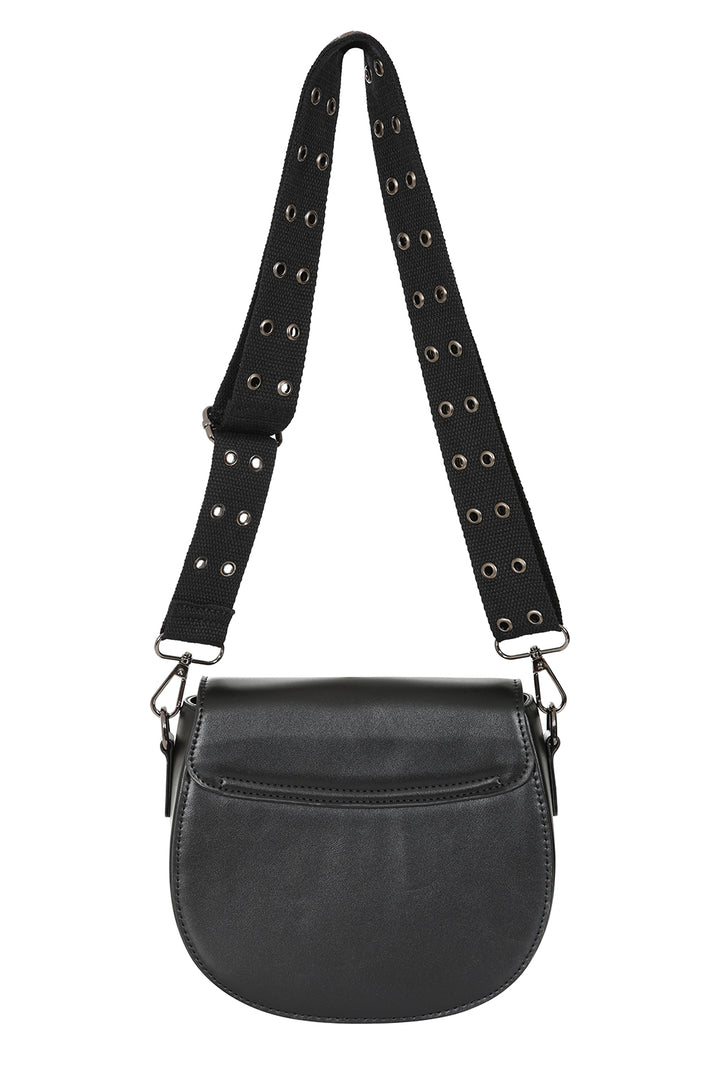 Banned's structured cross body bag featuring elegant moon phase ornament and detailed eyelet strap. Perfect gothic accessory combining celestial charm with adjustable comfort.