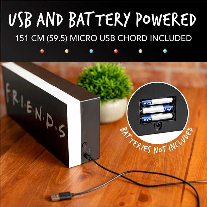 Size: 12x30cm. The black background allows the white Friends letters and the different coloured spacers to stand out when illuminated with the supplied USB cable or 3 AAA batteries (not included). The light can be used free standing or mounted on a wall.