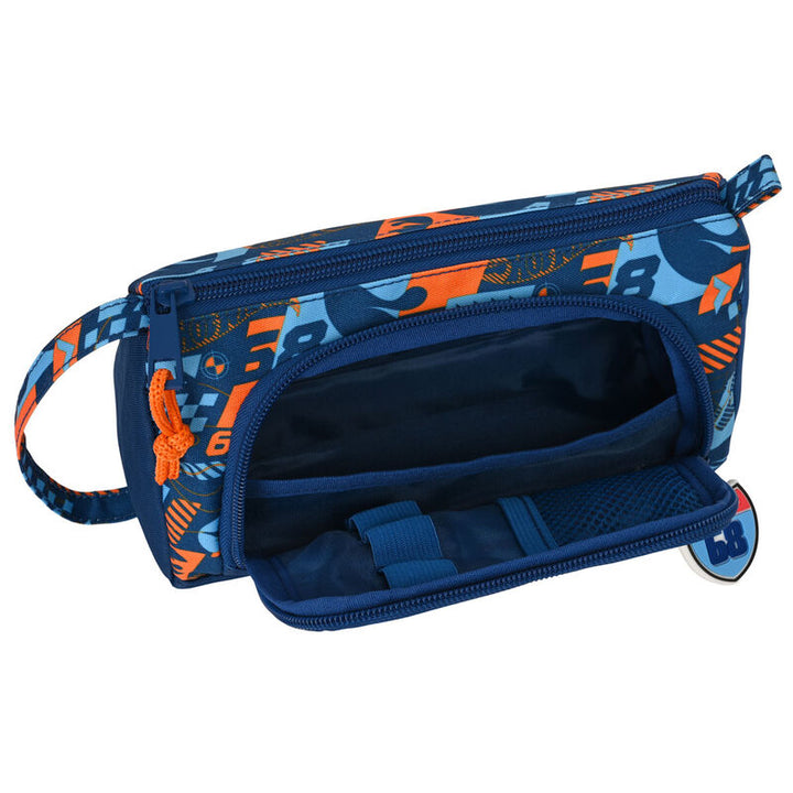 Size: 20x11x8,5cm. Large main compartment with zip. Interior side pockets. Front zipped flap with access to the interior. The flap contains 4 elastics for pens, highlighters and graphite, and a net pocket. Side handle.