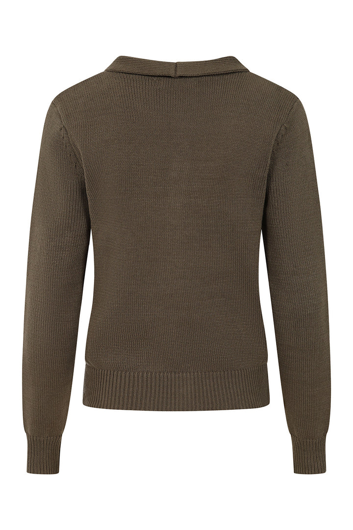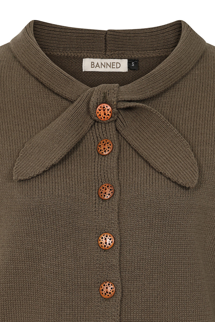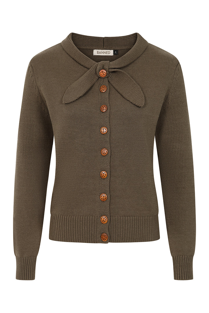 This sweet and feminine 1940's inspired Banned retro Katy Knot Cardigan is delightfully charming. This style has a bow detail at neckline with wooden ornate buttons that add extra charm! This cardigan is in a heavier weight yarn for extra cosiness. With full length sleeves with rib at the sleeve and waist hem.