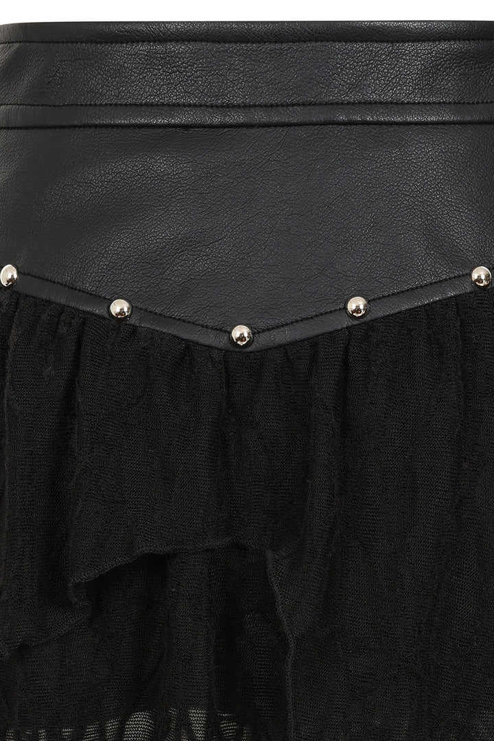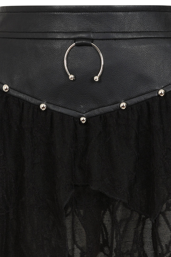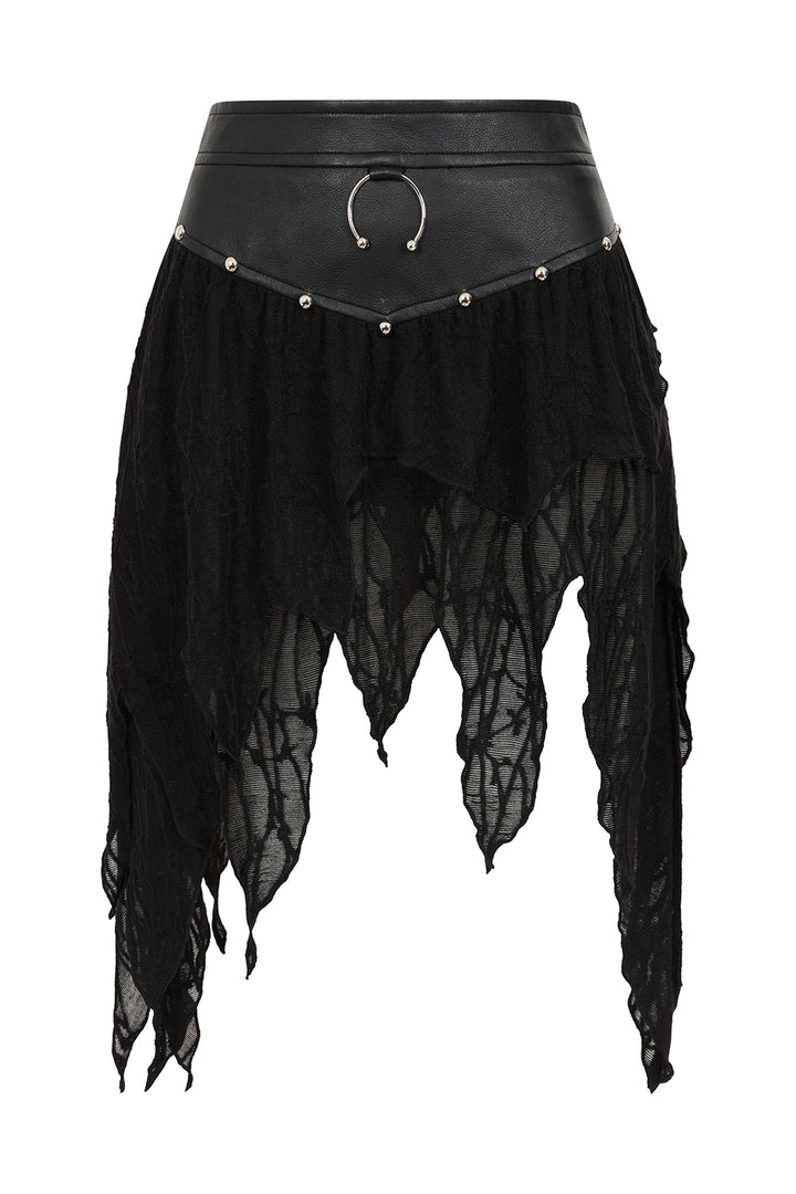 This alternative skirt features a bold combination of faux leather and textured knitted fabric, creating a striking and unique design. The high-waisted faux leather waistband provides structure and is accented with a metal O-ring detail and small stud embellishments, adding a touch of gothic-inspired edge. The lower portion of the skirt showcases layered, jagged-edged panels of lightweight, semi-sheer knitted fabric that flow gracefully for a whimsical, ethereal effect. The contrast between the sleek faux leather and the soft, textured knit creates a dynamic, alternative aesthetic, making this skirt a standout piece for those who appreciate edgy yet feminine styles.