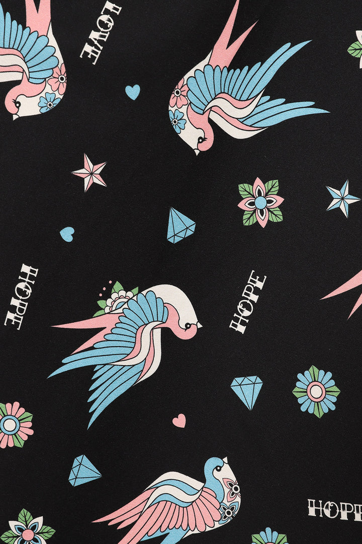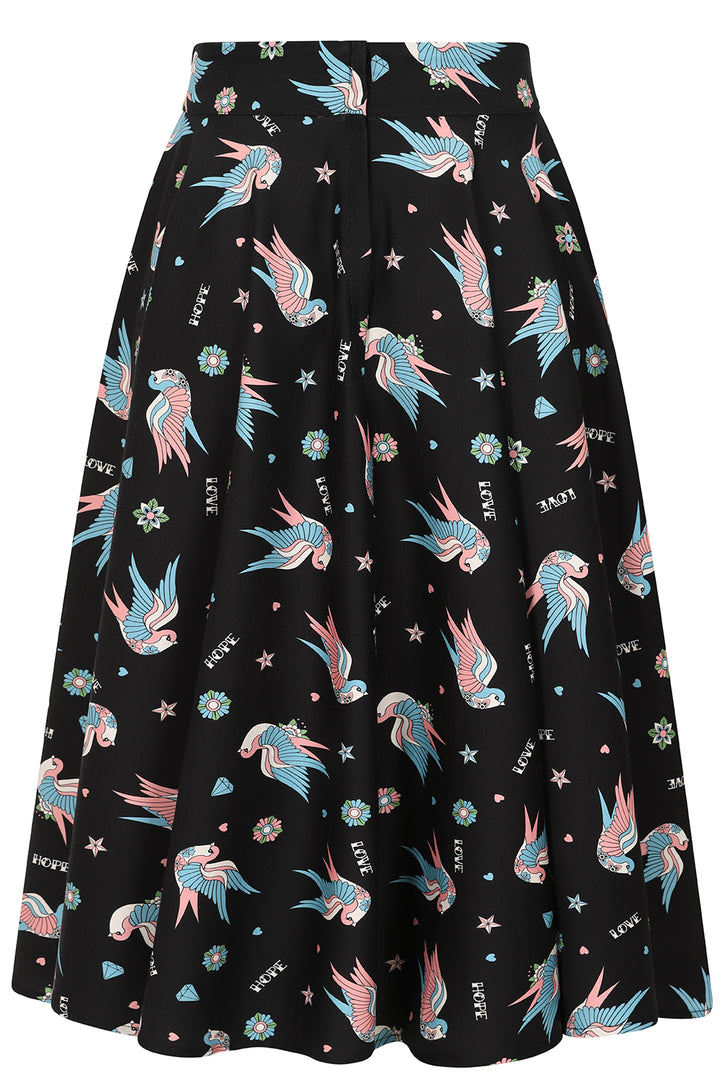 1950's inspired high waisted flare swing printed skirt with side seam pockets.