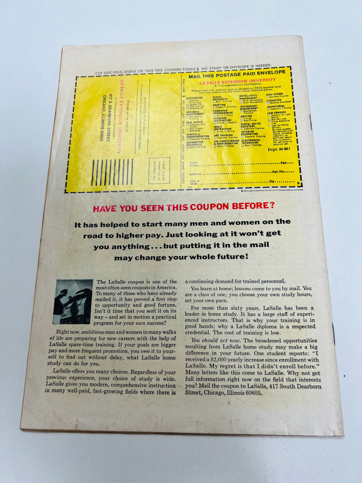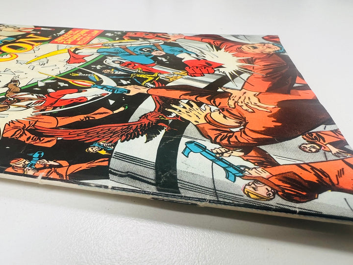 5.0 Grade - An average, second-hand, obviously read copy with marks and minor defects but still respectable and appealing. Printing lustre almost gone but not soiled or heavily stained and no tape evident, apart from a small piece of magic tape to repair a tear. There is noticeable wear on the spine and even the start of a spine roll and one staple may be slightly loose. The pages may be yellowing with the first signs of slight browning at the edges. The cover could have a tear or crease or the centrefold could have come away from the staples inside. NO PAGES OR PARTS MISSING. It must be complete in every way. For British comics, all the above applies though there will be slightly more edge and corner wear.