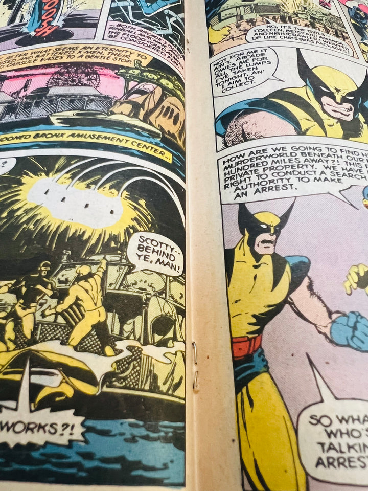 Captured by Arcade, the X-Men are being subjected to a variety of death traps in his lethal amusement park, Murderworld. Cyclops and Wolverine are currently facing off against Colossus, who has been brainwashed into thinking he is a "Proletarian", a Soviet loyalist.
