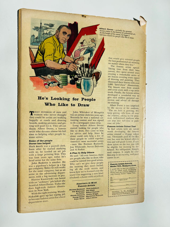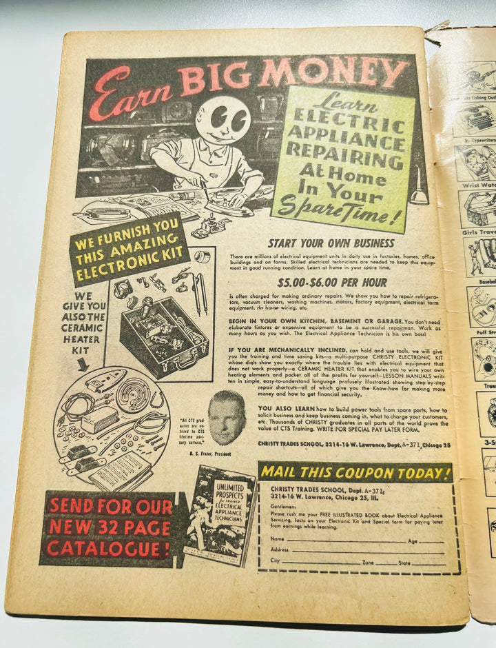 3.5 Grade - An average, second-hand, obviously read copy with marks and minor defects but still respectable and appealing. Printing lustre almost gone but not soiled or heavily stained and no tape evident, apart from a small piece of magic tape to repair a tear. There is noticeable wear on the spine and even the start of a spine roll and one staple may be slightly loose. The pages may be yellowing with the first signs of slight browning at the edges. The cover could have a tear or crease or the centrefold could have come away from the staples inside. NO PAGES OR PARTS MISSING. It must be complete in every way. For British comics, all the above applies though there will be slightly more edge and corner wear.