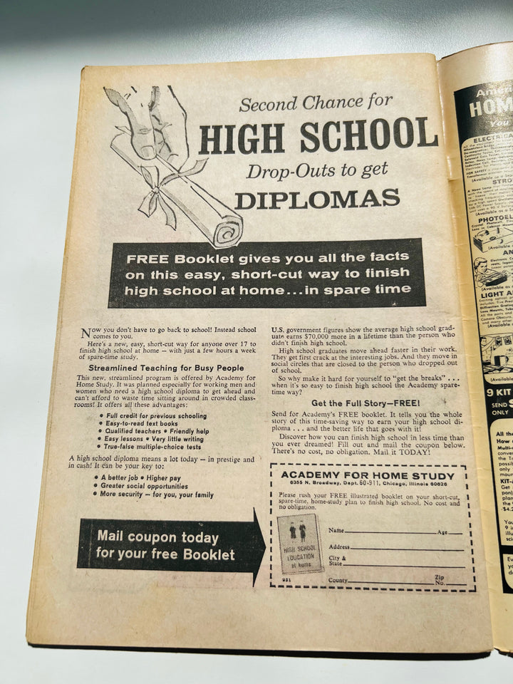 4.0 Grade - An average, second-hand, obviously read copy with marks and minor defects but still respectable and appealing. Printing lustre almost gone but not soiled or heavily stained and no tape evident, apart from a small piece of magic tape to repair a tear. There is noticeable wear on the spine and even the start of a spine roll and one staple may be slightly loose. The pages may be yellowing with the first signs of slight browning at the edges. The cover could have a tear or crease or the centrefold could have come away from the staples inside. NO PAGES OR PARTS MISSING. It must be complete in every way. For British comics, all the above applies though there will be slightly more edge and corner wear.