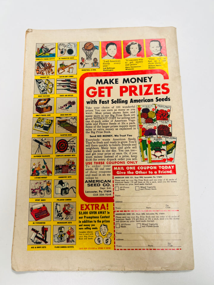 4.5 Grade - An average, second-hand, obviously read copy with marks and minor defects but still respectable and appealing. Printing lustre almost gone but not soiled or heavily stained and no tape evident, apart from a small piece of magic tape to repair a tear. There is noticeable wear on the spine and even the start of a spine roll and one staple may be slightly loose. The pages may be yellowing with the first signs of slight browning at the edges. The cover could have a tear or crease or the centrefold could have come away from the staples inside. NO PAGES OR PARTS MISSING. It must be complete in every way. For British comics, all the above applies though there will be slightly more edge and corner wear.
