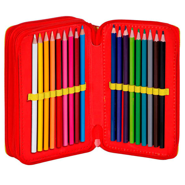 Size: 21x14x7cm. Complete school case. 3 compartments and zip closure. Contains notepad, ruler, pencil sharpener, eraser, pencil and 2 pens. 18 coloured pencils and 18 coloured markers.