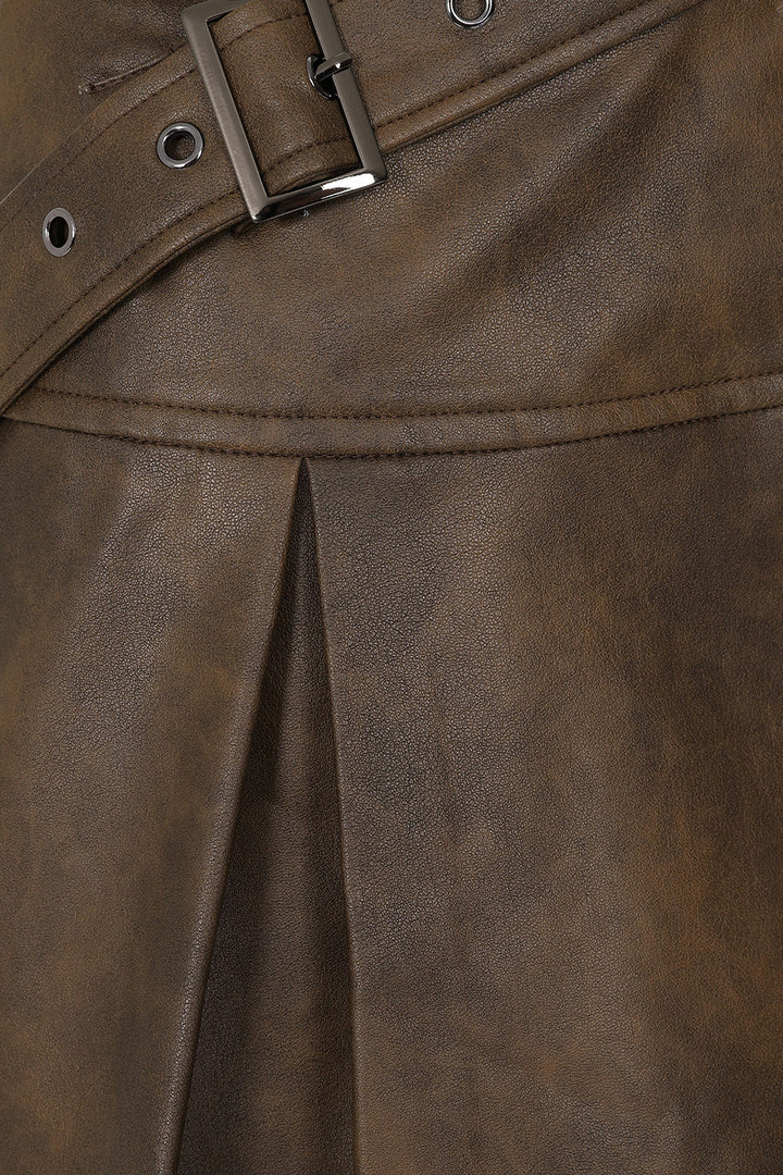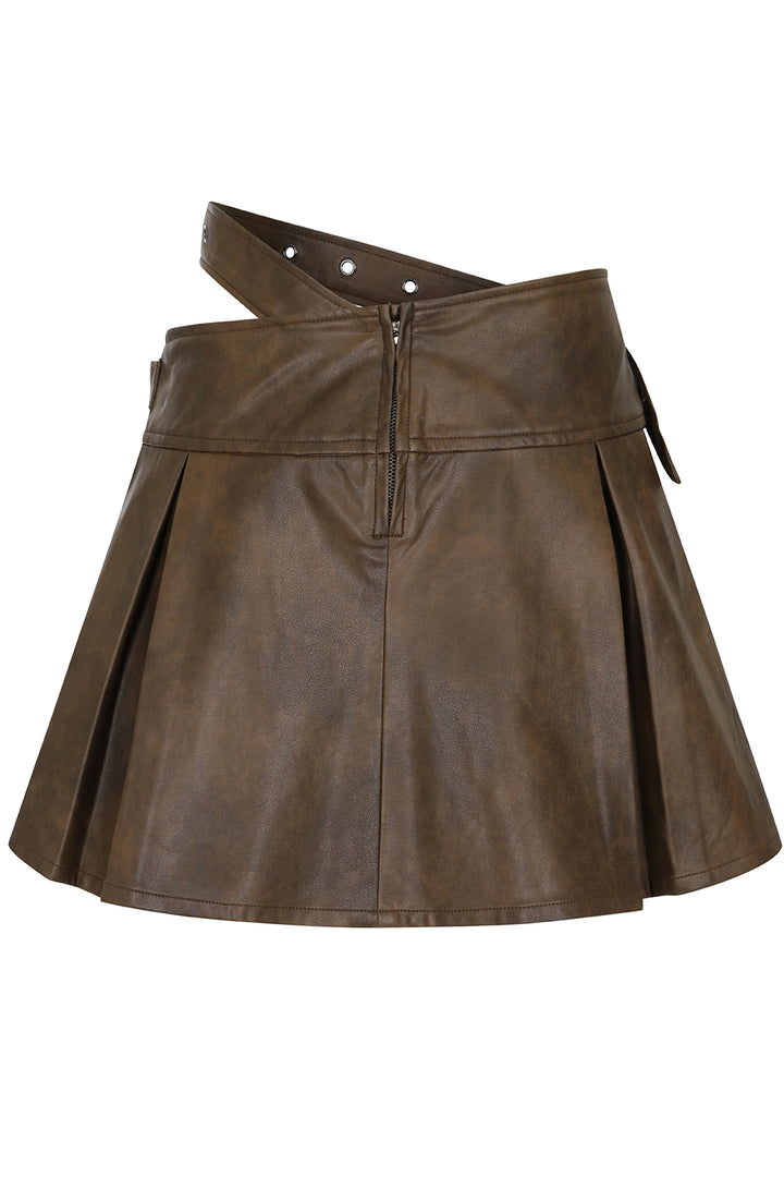 This PU skirt has a faux leather appearance with a rich brown tone. Its design is structured with pleats, giving it a flared, mini-skirt silhouette. The skirt features a double-belted waistband with metallic eyelets and buckles, adding a bold and edgy aesthetic. The belts overlap asymmetrically, enhancing its unique and modern style. The material mimics distressed leather, contributing to a rugged look.