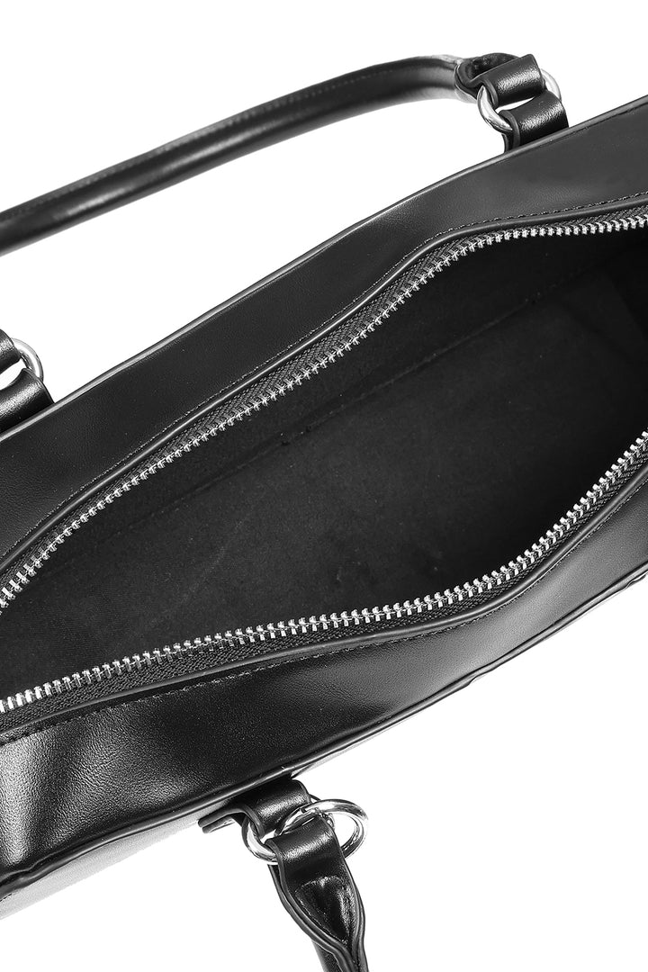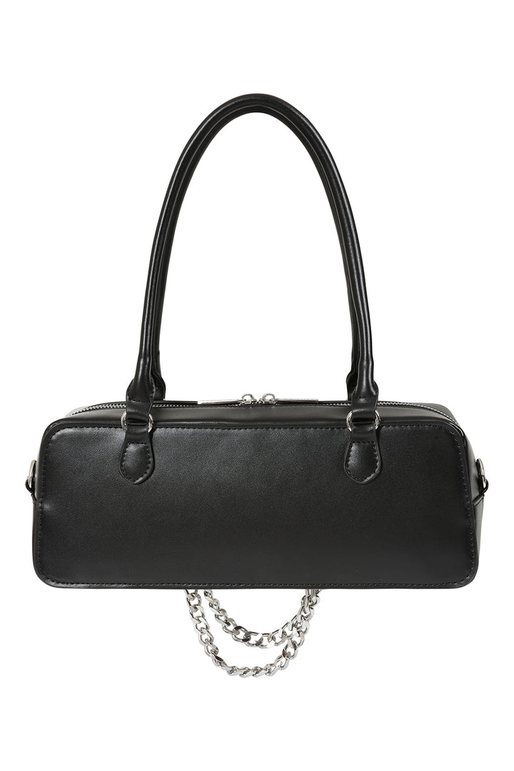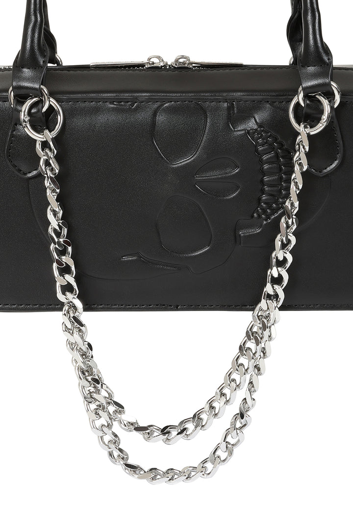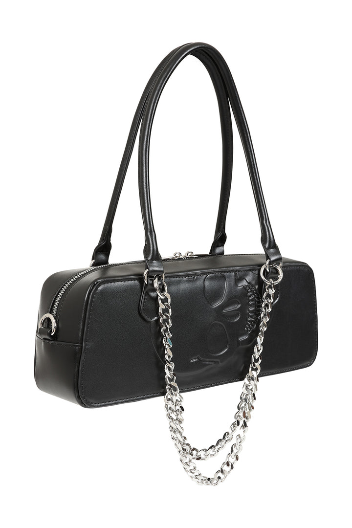 The Midnight Bound Handbag by BANNED Apparel is a sleek gothic accessory featuring a striking black Embossed skull motif and detachable decorative silver chain with half moons detailing. This elegant barrel-shaped bag combines dark aesthetics with modern functionality. The design showcases silver O-ring hardware connected by chains along the front panel, complemented by both structured top handles and an adjustable shoulder strap for versatile carrying options.