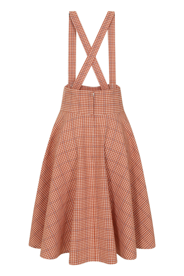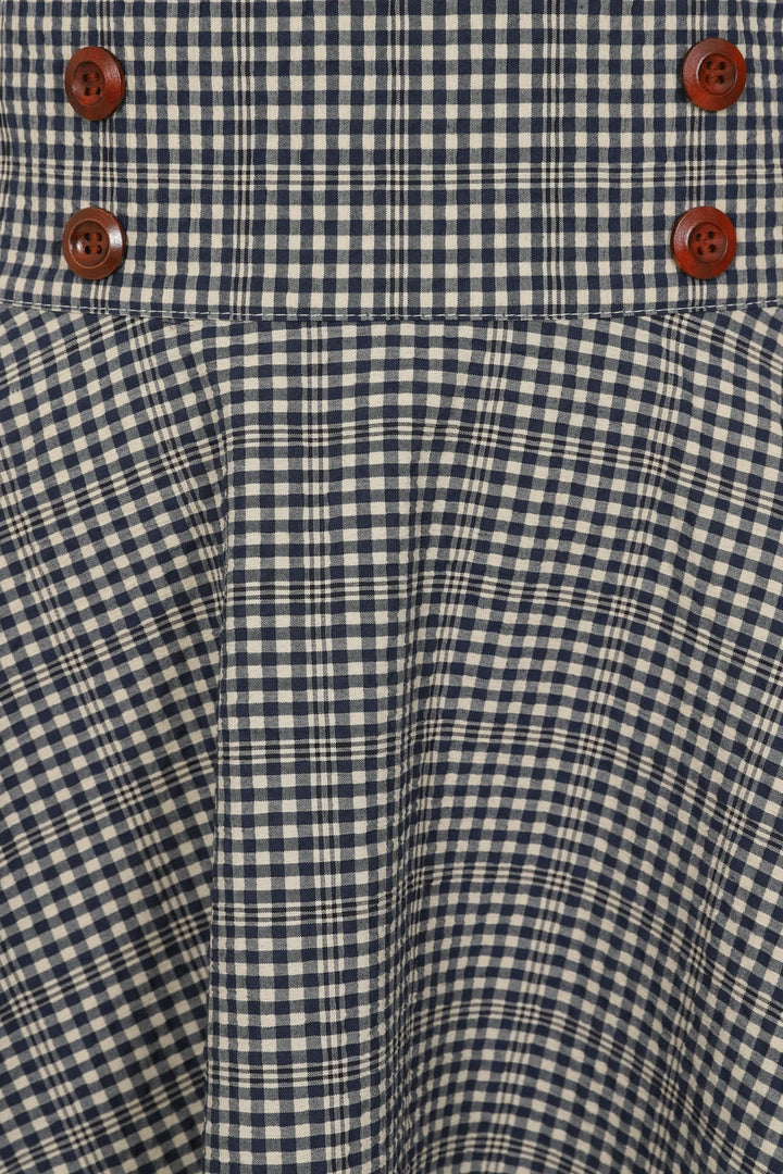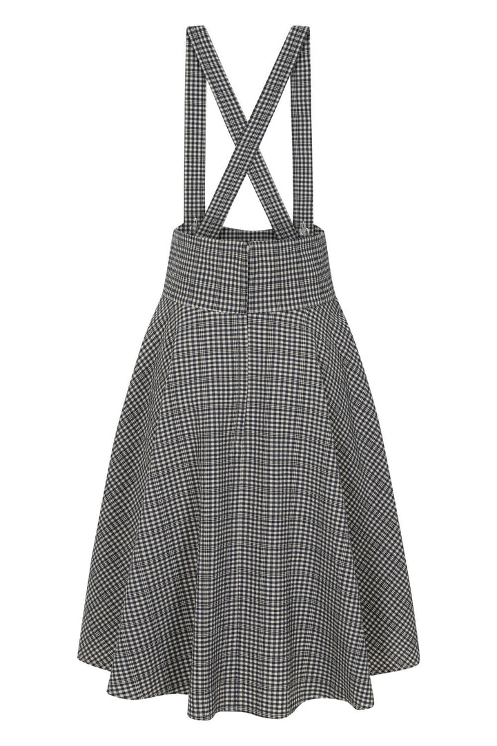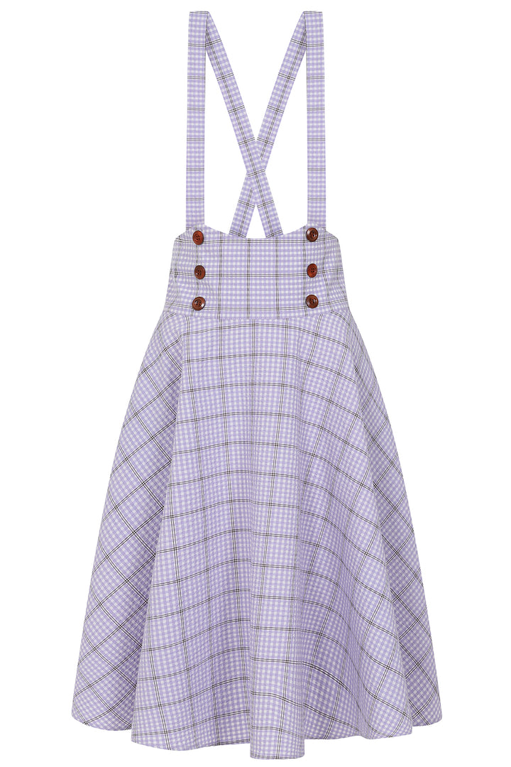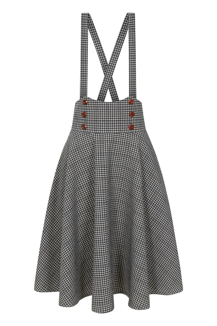 CHECK HIGHWAISTED FLARE SKIRT WITH DETACHABLE STRAPS. FRONT BUTTON DETAILING AND SIDE SEAM POCKETS.