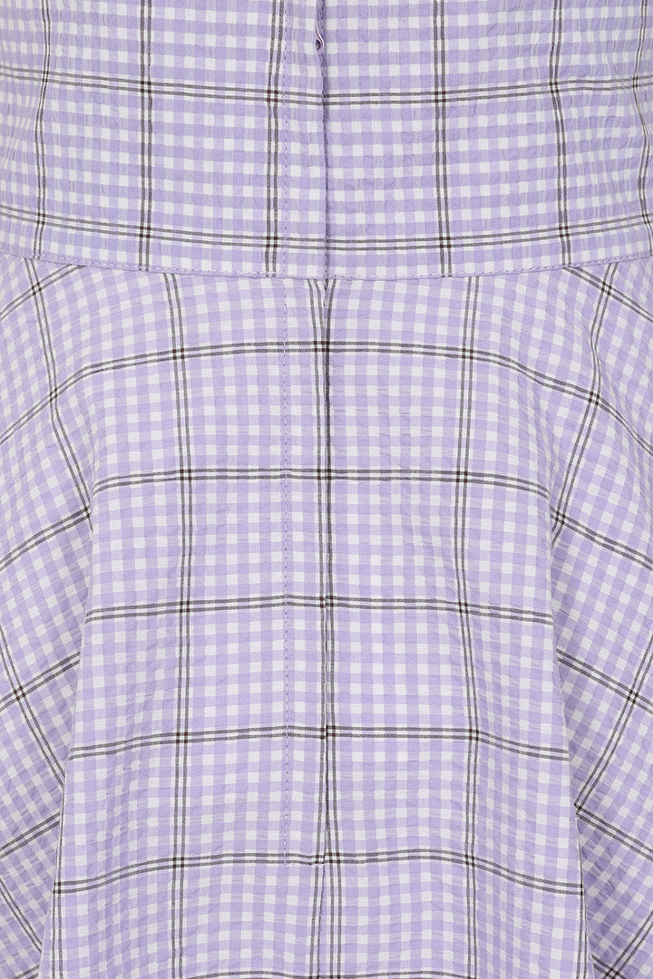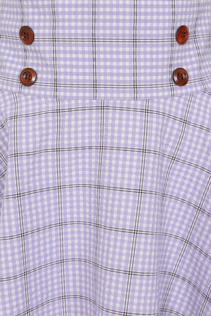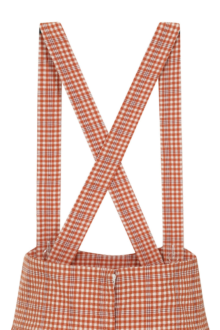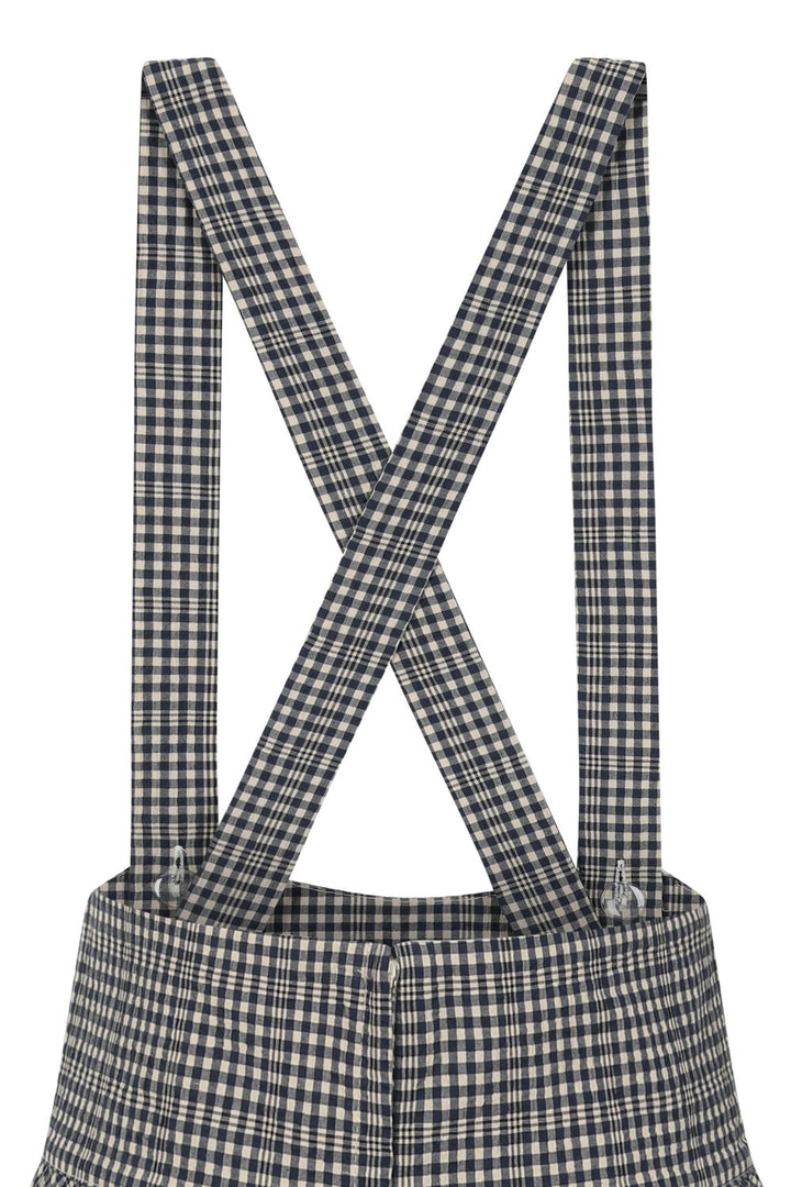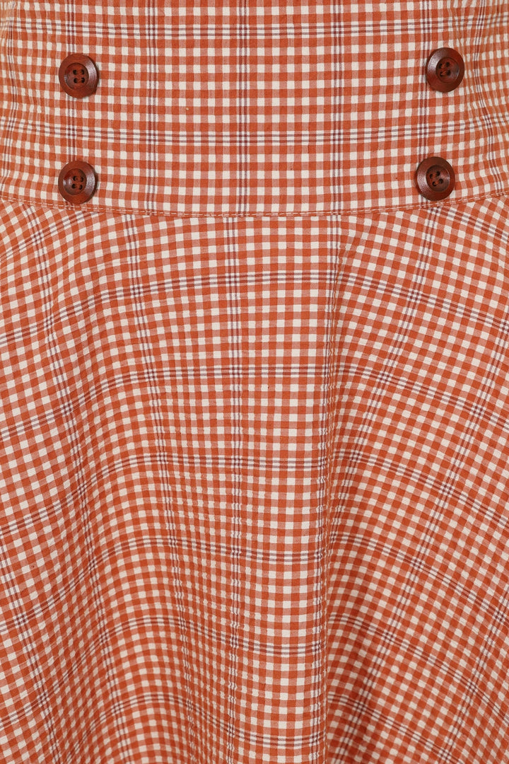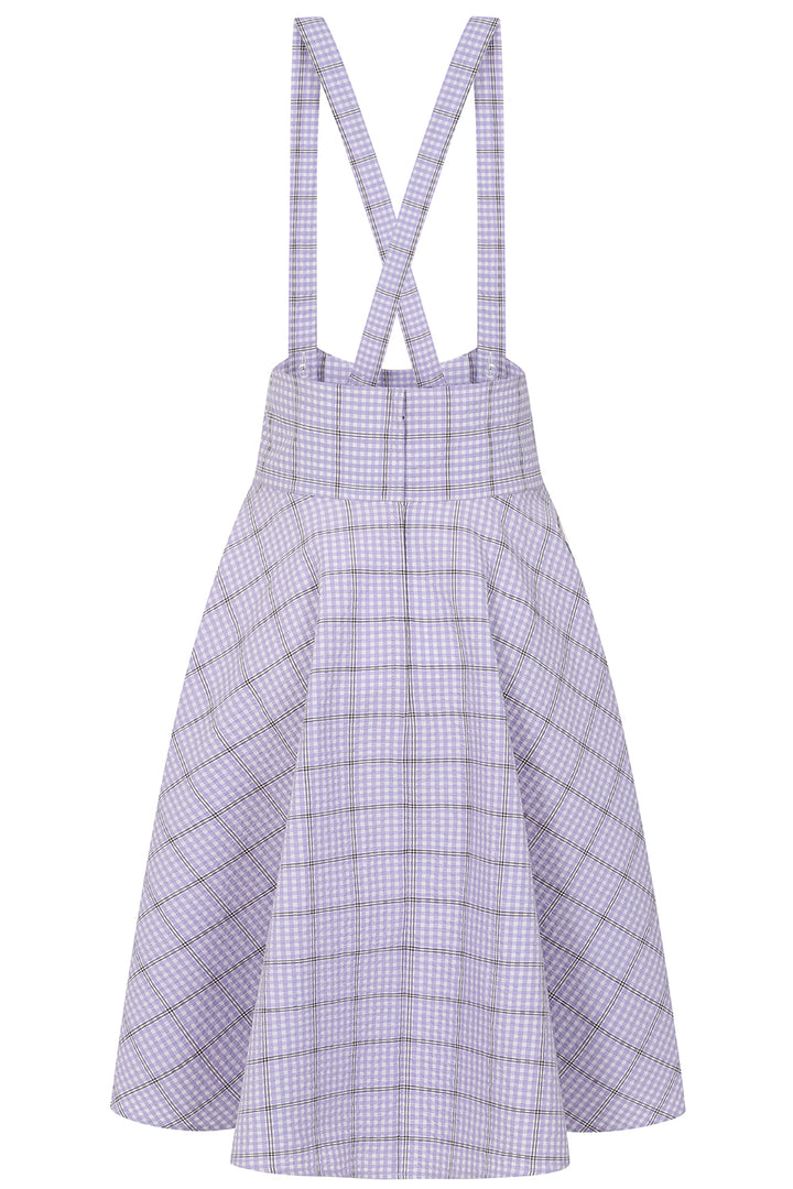 CHECK HIGHWAISTED FLARE SKIRT WITH DETACHABLE STRAPS. FRONT BUTTON DETAILING AND SIDE SEAM POCKETS.