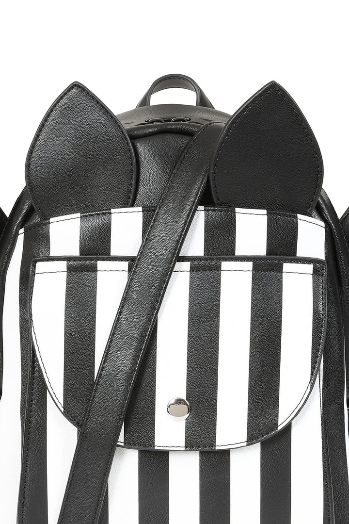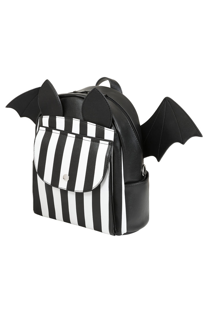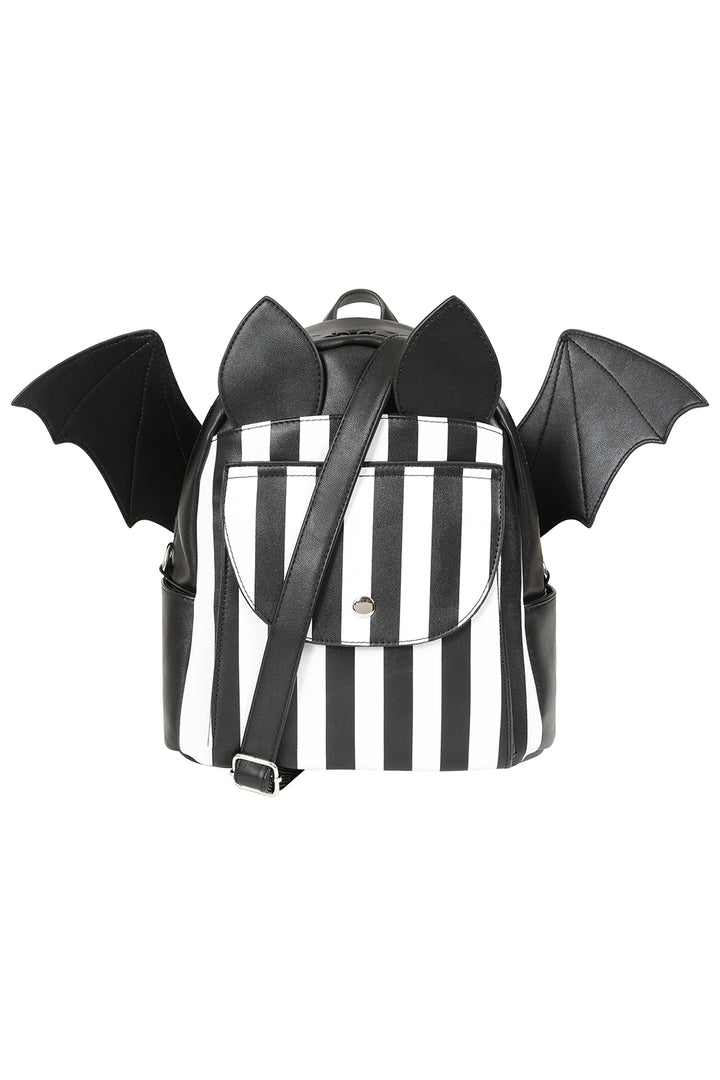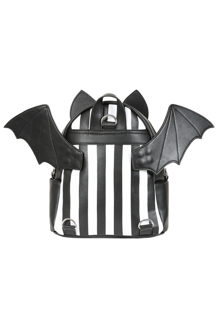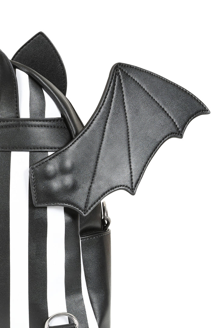 The Nightfall Bat Backpack by BANNED Apparel is a striking gothic accessory featuring bold black and white vertical stripes with removable bat wings. This unique backpack combines playful Halloween aesthetics with practical everyday functionality. The distinctive design includes detachable black bat wings that can be added or removed to suit your style preference, making it versatile for both statement gothic fashion and casual wear.