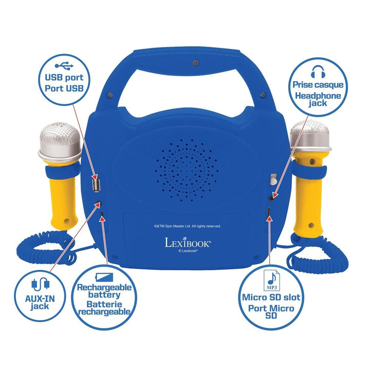 Paw Patrol portable Karaoke player for kids, works wirelessly with all Bluetooth enabled devices! 2 microphones included. oma AUX IN, USB port and TF / micro SD card (up to 32 GB) for listening to songs on external audio media. Headphone jack. Power supply: 1200 mAh rechargeable battery via USB-C (cable included).contains a storage space on the back to store the various cables.