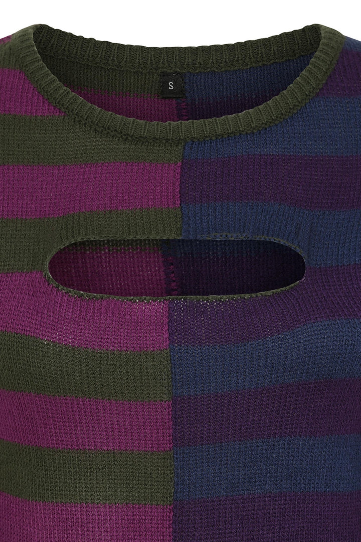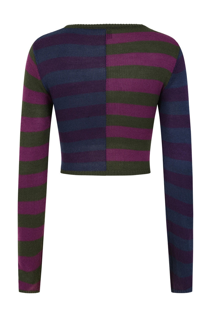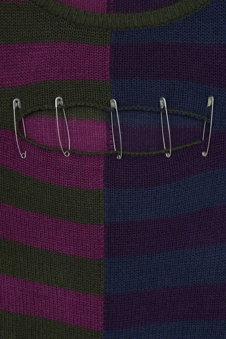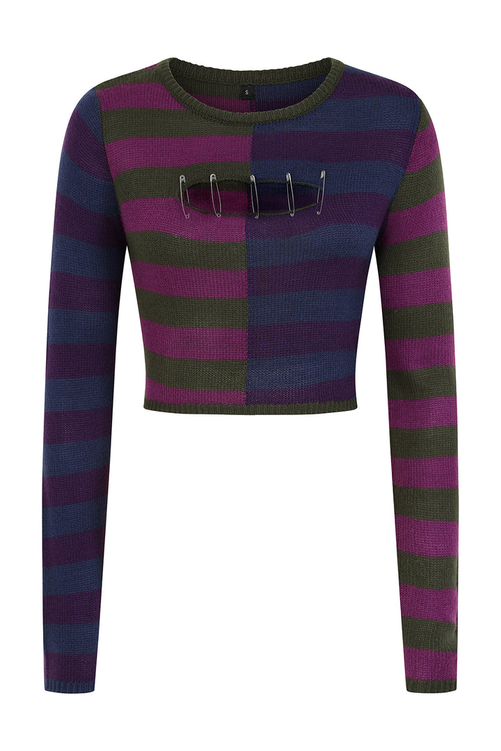 SOFT AND STRETCH KNIT. CROPPED. STRIPED DESIGN WITH HALF AND HALF DETAIL. FRONT CUT OUT WITH SAFETY PINS DETAIL. ROUNDED NECKLINE. LONG SLEEVES. FITTED. REFER TO CARE LABLE FOR WASHING INSTRUCTIONS.