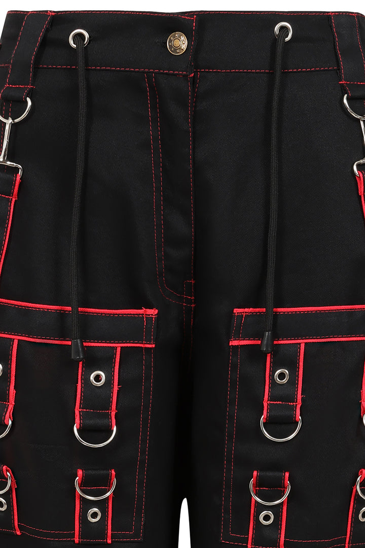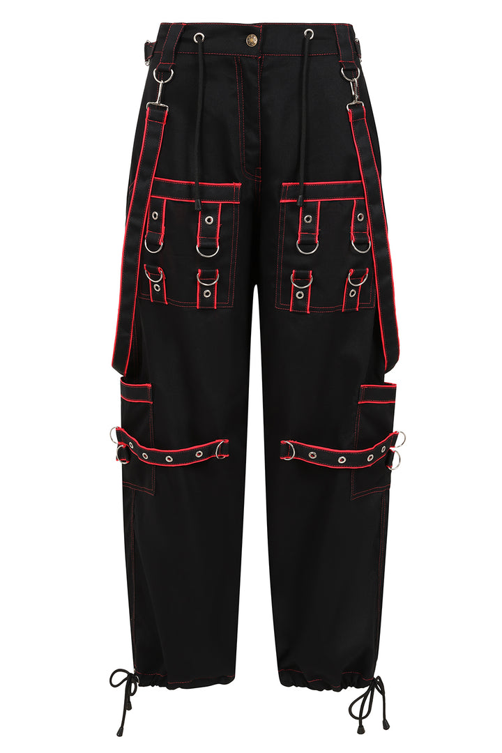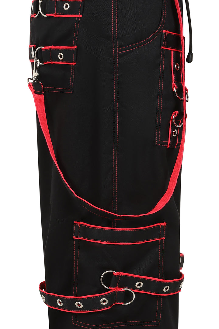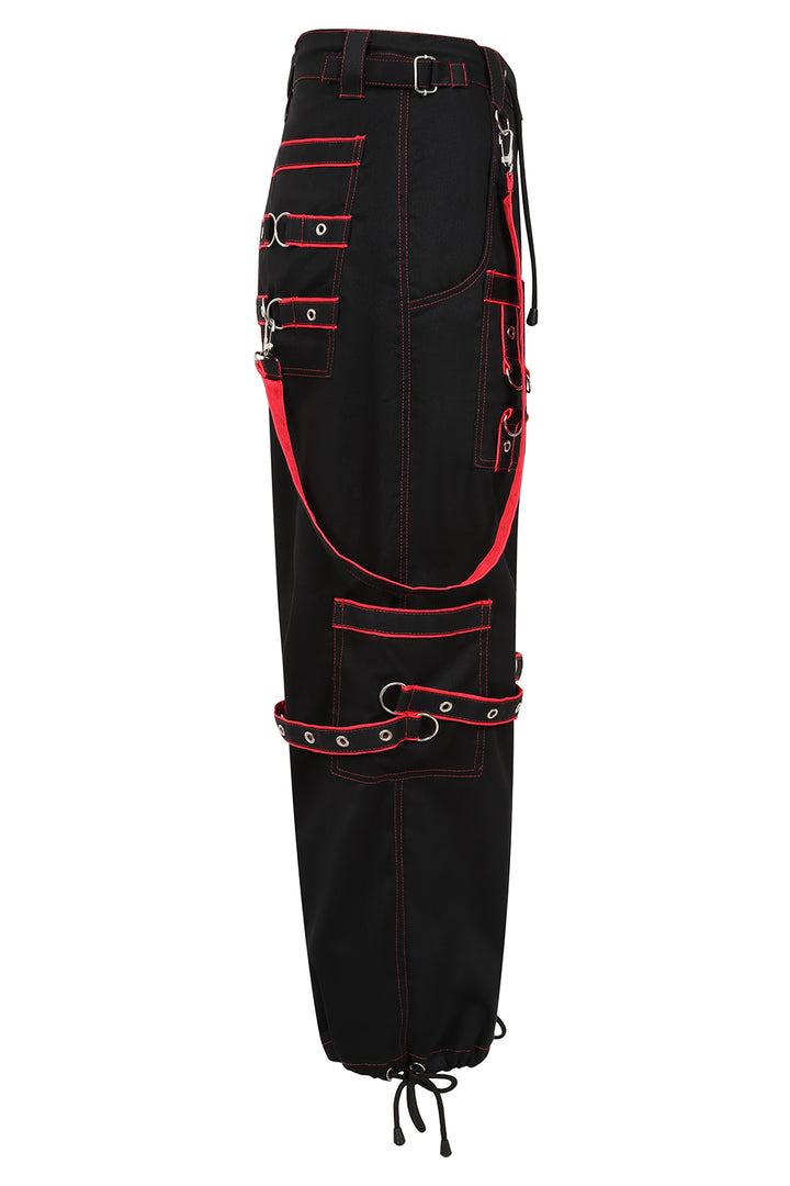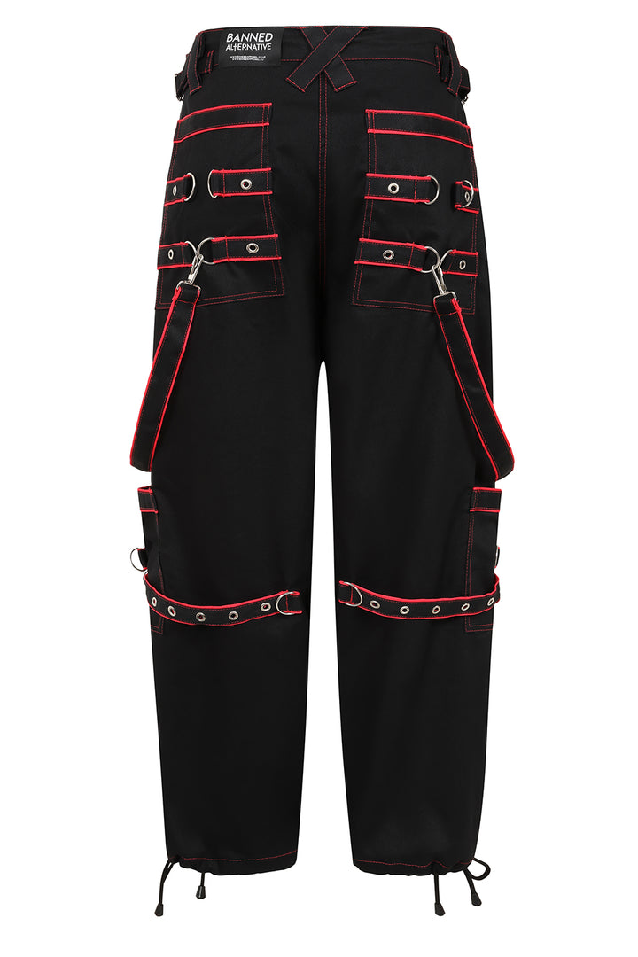 These alternative trousers boast a striking combination of black and red, creating a bold and edgy appearance. They are adorned with multiple straps, buckles, and chains, which enhance their industrial and punk-inspired aesthetic. The red stitching and detailing throughout the design provide a vivid contrast against the black fabric, highlighting the intricate features. Functional and decorative elements such as cargo-style pockets and adjustable straps add both practicality and visual interest. The trousers also include side accessories, such as detachable straps or belts, adding to their dynamic and statement-making style. These trousers are perfect for those looking to make a bold fashion statement with a rebellious edge.