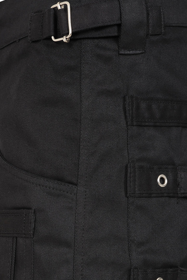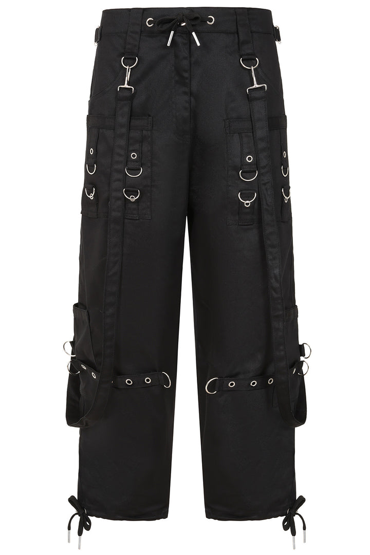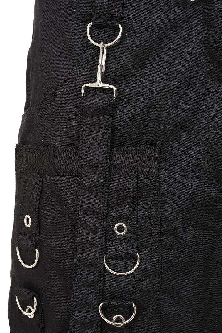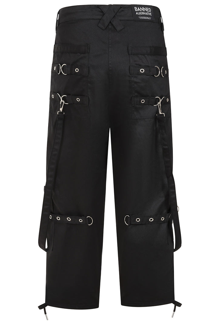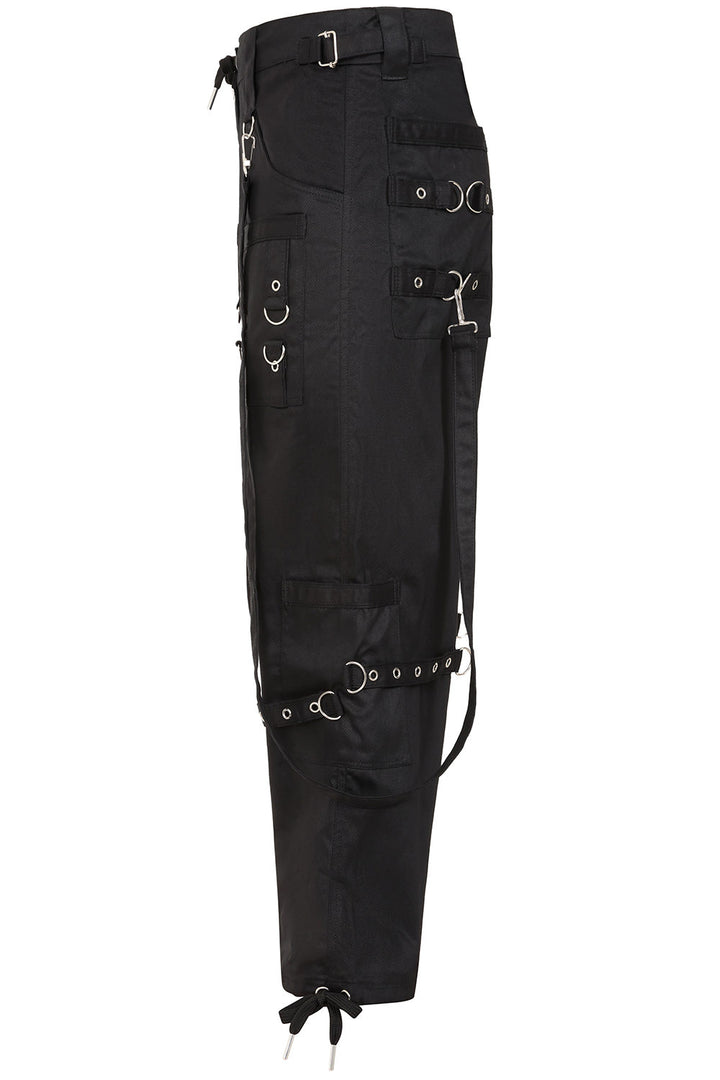 These alternative trousers boast a striking combination of black and red, creating a bold and edgy appearance. They are adorned with multiple straps, buckles, and chains, which enhance their industrial and punk-inspired aesthetic. The red stitching and detailing throughout the design provide a vivid contrast against the black fabric, highlighting the intricate features. Functional and decorative elements such as cargo-style pockets and adjustable straps add both practicality and visual interest. The trousers also include side accessories, such as detachable straps or belts, adding to their dynamic and statement-making style. These trousers are perfect for those looking to make a bold fashion statement with a rebellious edge.