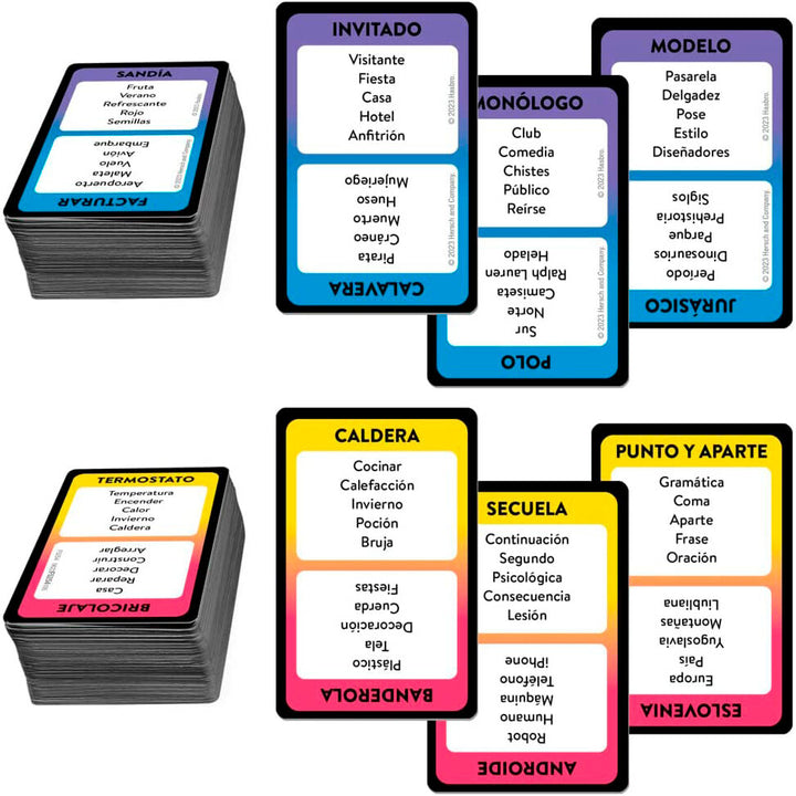 Spanish game. Age: +13 years old. Number of players: +4. Its the classic Taboo, the fun game of forbidden words, with a modern twist. In the Taboo board game you race against time to get your team to say the key word without using any of the Taboo words on the cards. The Taboo word game includes new cards with themes of pop culture, trends and more. It includes 212 cards with 848 keywords to play over and over again. Players have the option to use the online clock, horn and scoreboard, or play with the included hourglass, horn and scoreboard. This group game is ideal for play at get-togethers and family gatherings. Its a party game thats easy to bring to bachelorette parties, road trips and more.