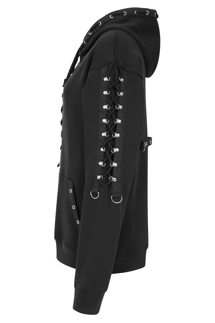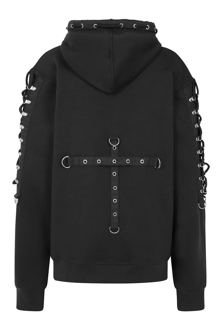 This hoodie features a unique and alternative design, blending functional elements with bold styling. It is predominantly black, with metal grommets and eyelet detailing running down the front, sleeves, and back, giving it a striking industrial or punk-inspired aesthetic. The front showcases a central panel with laced or grommet embellishments that draw attention to the hoodie's structured look. The sleeves are adorned with similar metallic accents, emphasizing a cohesive and edgy theme. The back features a cross-like pattern created with metal hardware, further enhancing its alternative vibe. Practical details such as a kangaroo pocket with matching grommet detailing complete the design, making this hoodie both functional and a bold fashion statement.