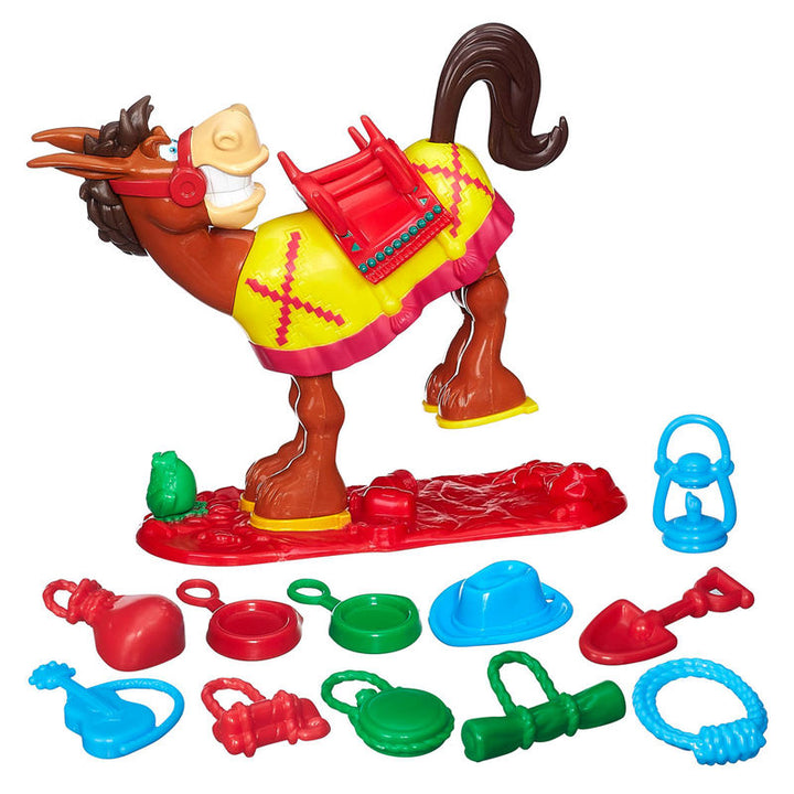 Size: 6,6x26,7x26,7cm. Includes plastic burrito with base, 13 pieces of plastic game (saddle, blanket, shovel, canteen, 2 pans, sleeping bag, flashlight, hat, string, dynamite, bag and guitar), and instructions.