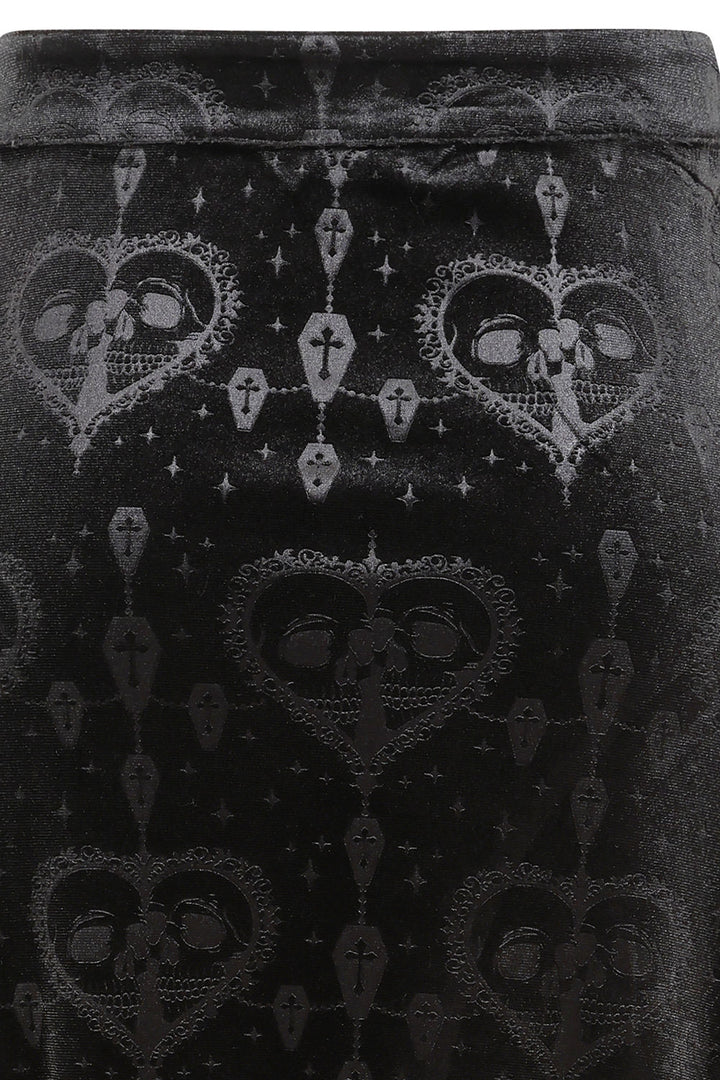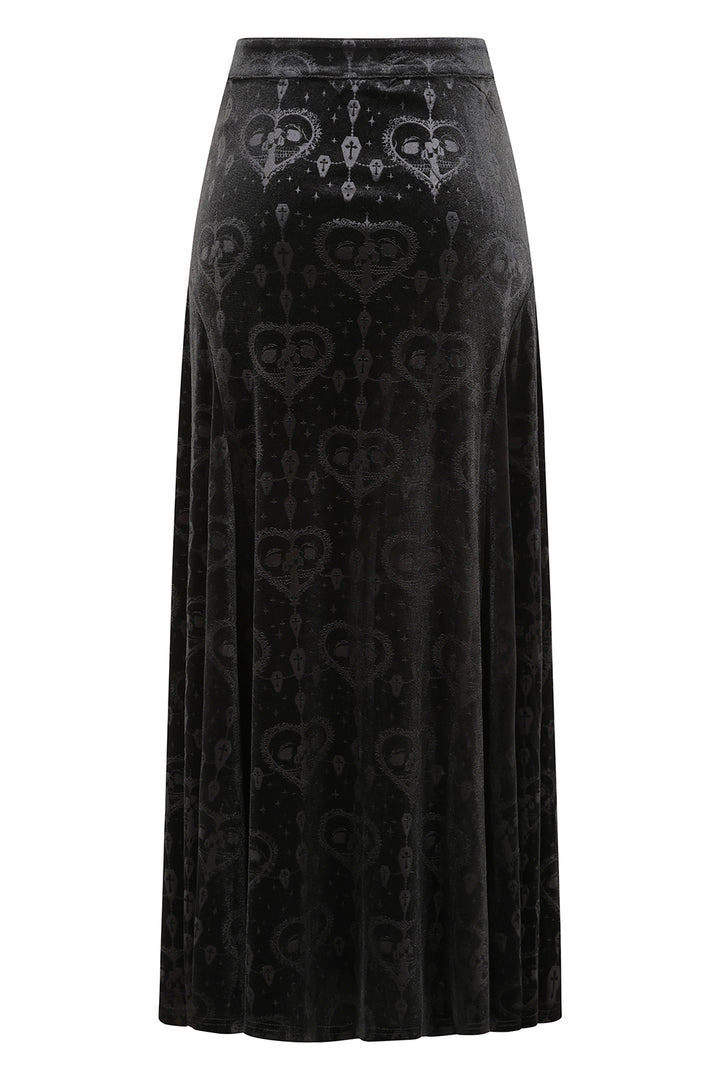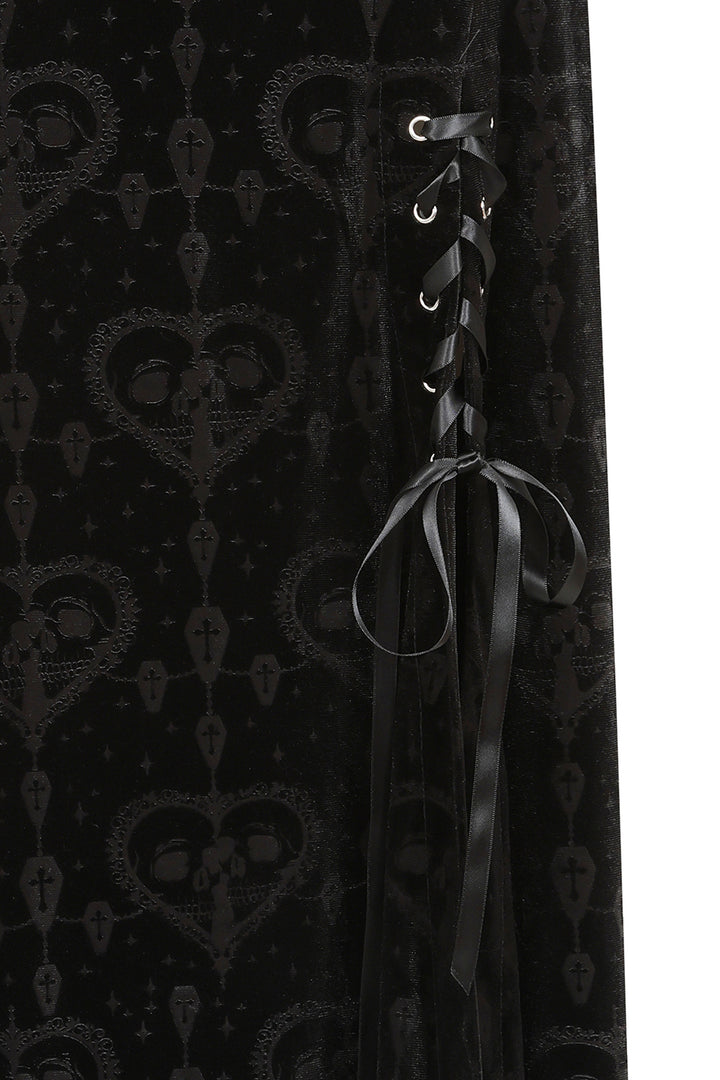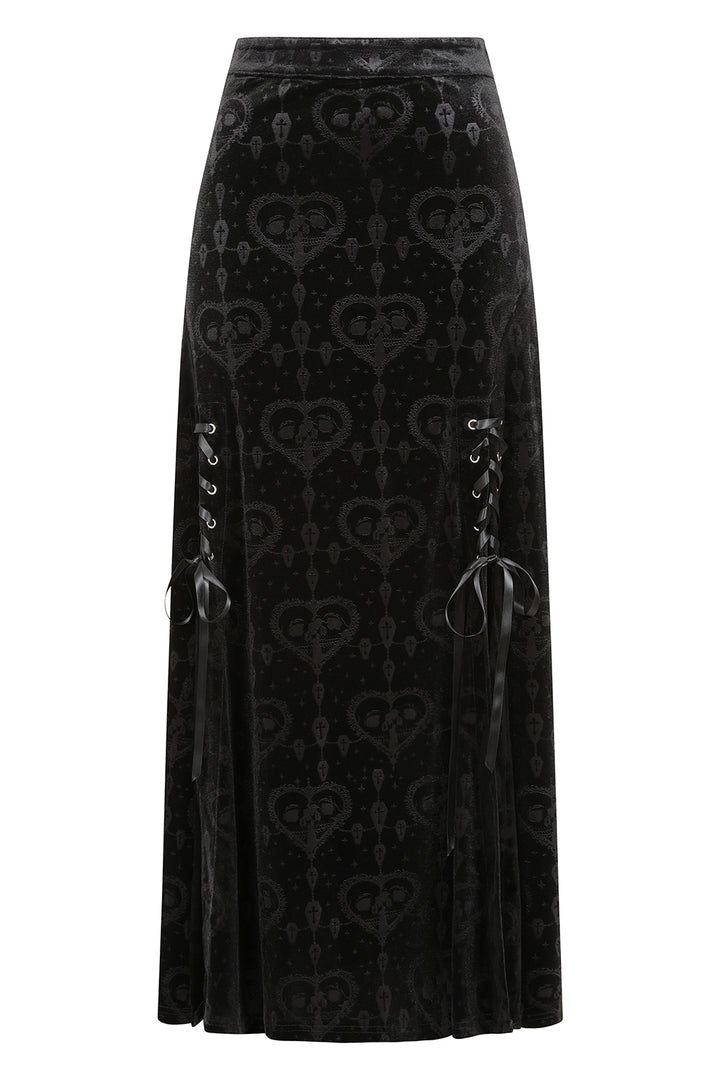 This long gothic skirt is crafted from luxurious burnout velvet, featuring a unique in-house designed pattern that enhances its darkly elegant appeal. The fabric displays intricate, with a rich, textured finish, creating a dramatic yet refined look. The skirt's form-fitting upper portion flows into a subtly flared hemline, offering a flattering silhouette. Lace-up accents with grommet detailing at the front add an edgy touch, while vertical seams enhance the overall structure and elongate the figure. Perfect for gothic or alternative wardrobes, this skirt exudes sophistication with a bold, distinctive aesthetic.