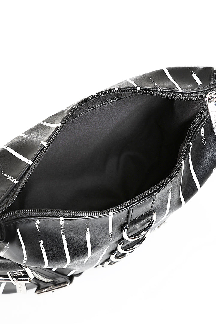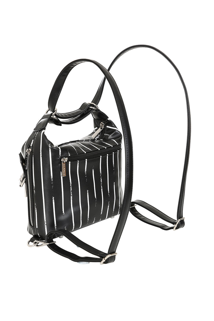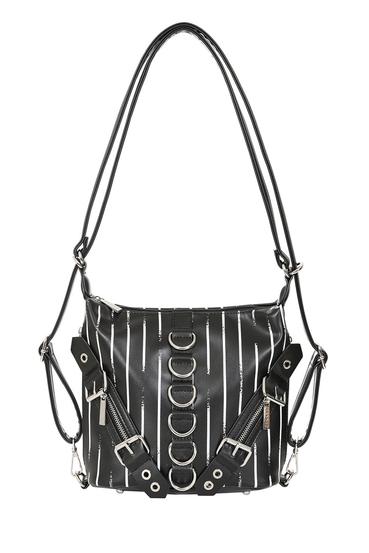 Versatile black and white pin striped mini backpack by BANNED Apparel that easily converts from a backpack to a shoulder bag. This practical small-sized bag features a striking vertical striped pattern and a center column of six metal D-rings. The transformable design includes decorative buckled straps with silver zippers on each side, metal grommets, and adjustable straps for multiple carrying options. Made from durable faux leather with a modern gothic/industrial aesthetic. Perfect for those seeking a compact yet versatile bag that adapts to different styling needs.