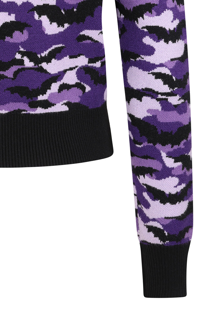 This alternative jumper showcases a unique, in-house design featuring a vibrant purple camouflage pattern interspersed with black bat silhouettes, creating a bold and playful aesthetic. The fitted silhouette is complemented by a high ribbed neckline, ribbed cuffs, and hem, adding structure and a snug fit. The combination of the striking purple hues and gothic bat details makes this piece a standout for those who love creative and edgy designs. Perfect for adding a statement element to an alternative wardrobe, it blends whimsical and gothic influences seamlessly