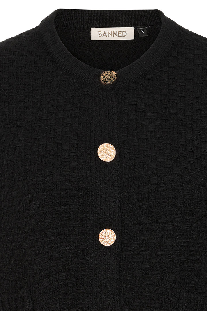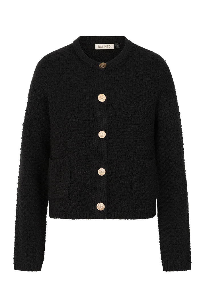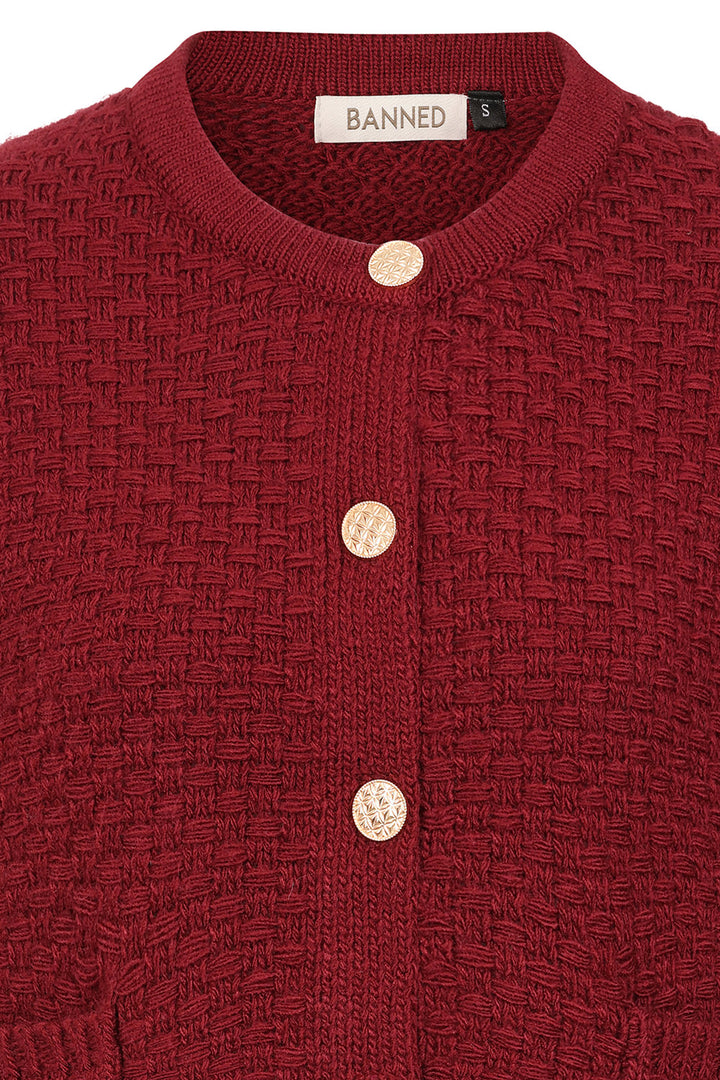Banned's luxurious 1940s-inspired crop cardigan in soft wool blend featuring textured knit pattern, elegant gold buttons, and practical patch pockets. Perfect vintage silhouette with modern comfort.available in various colours.
